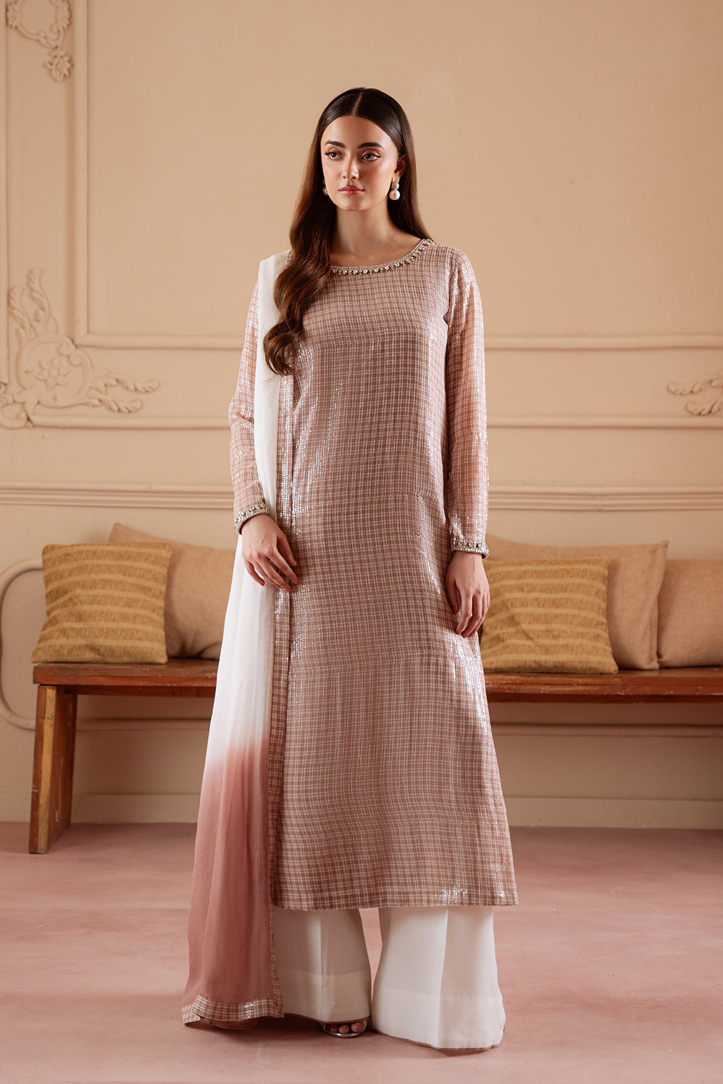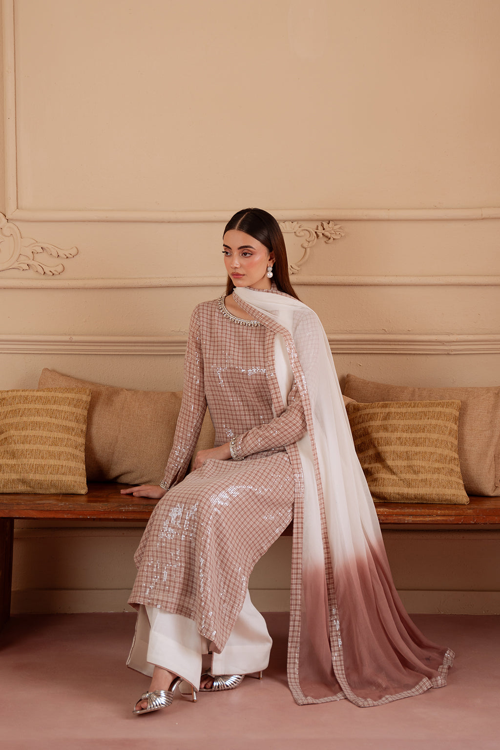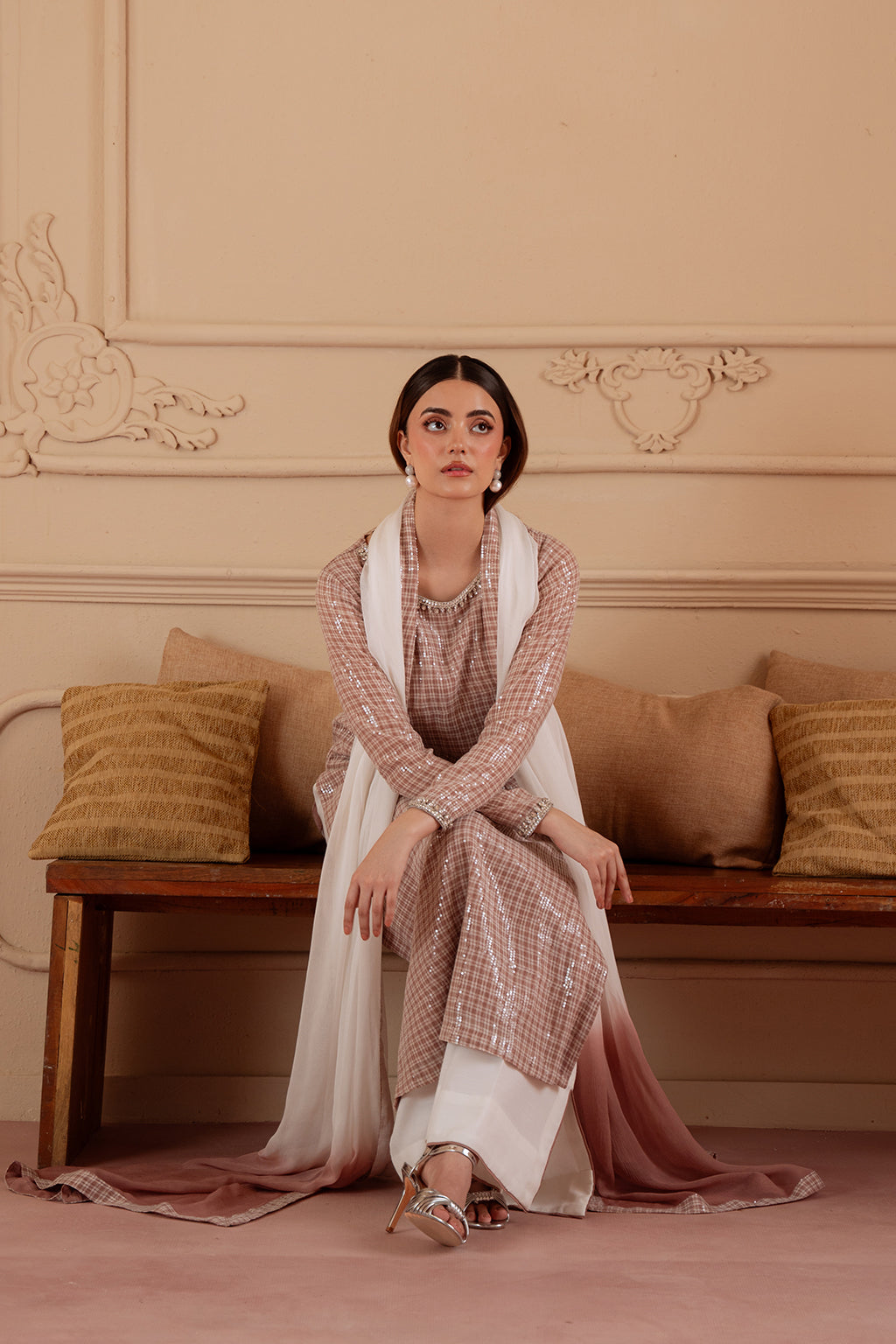 Perfect three-piece features fancy chiffon shirt with hand embellished neckline paired with rawsilk trouser and tie-dye chiffon dupatta