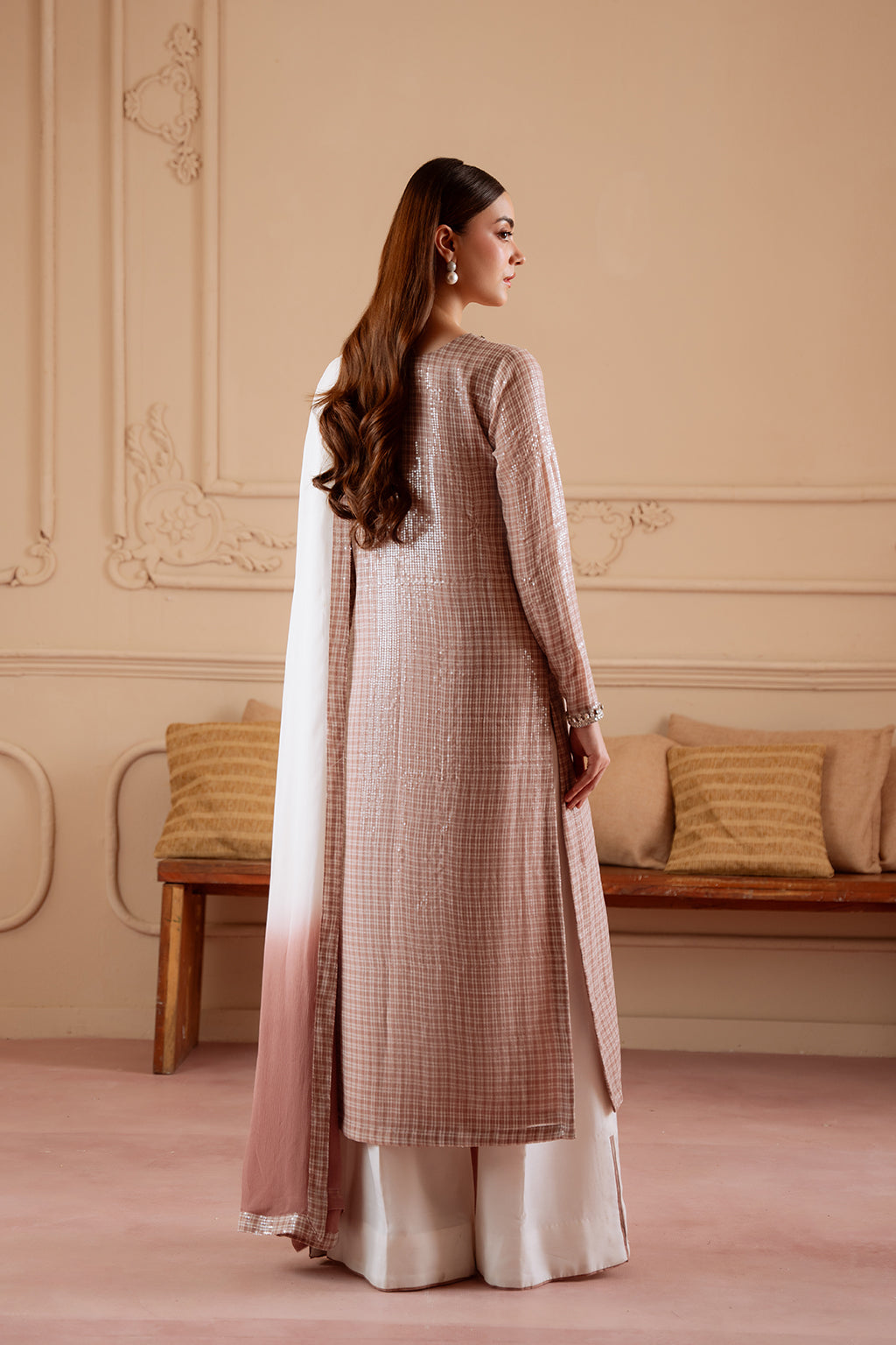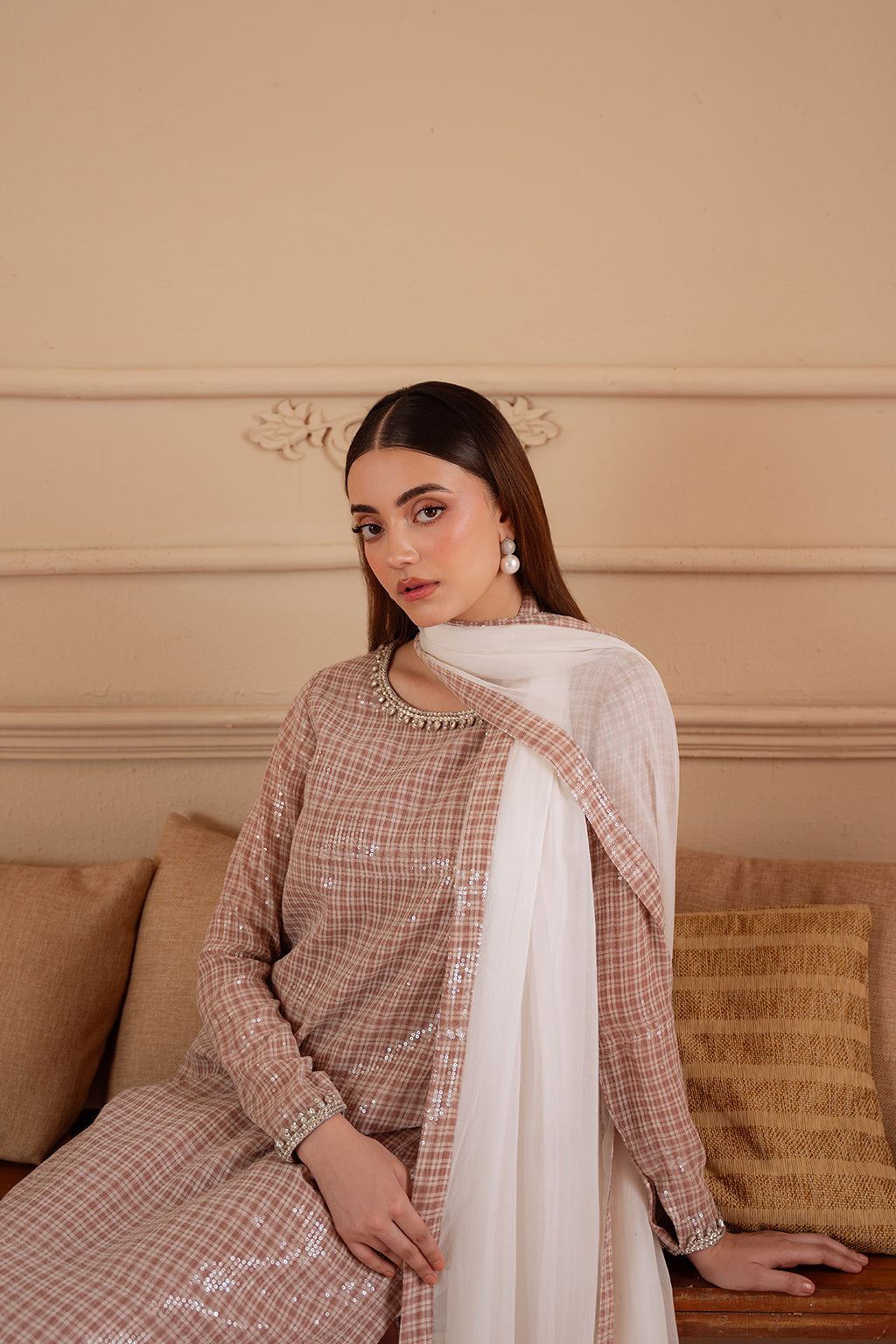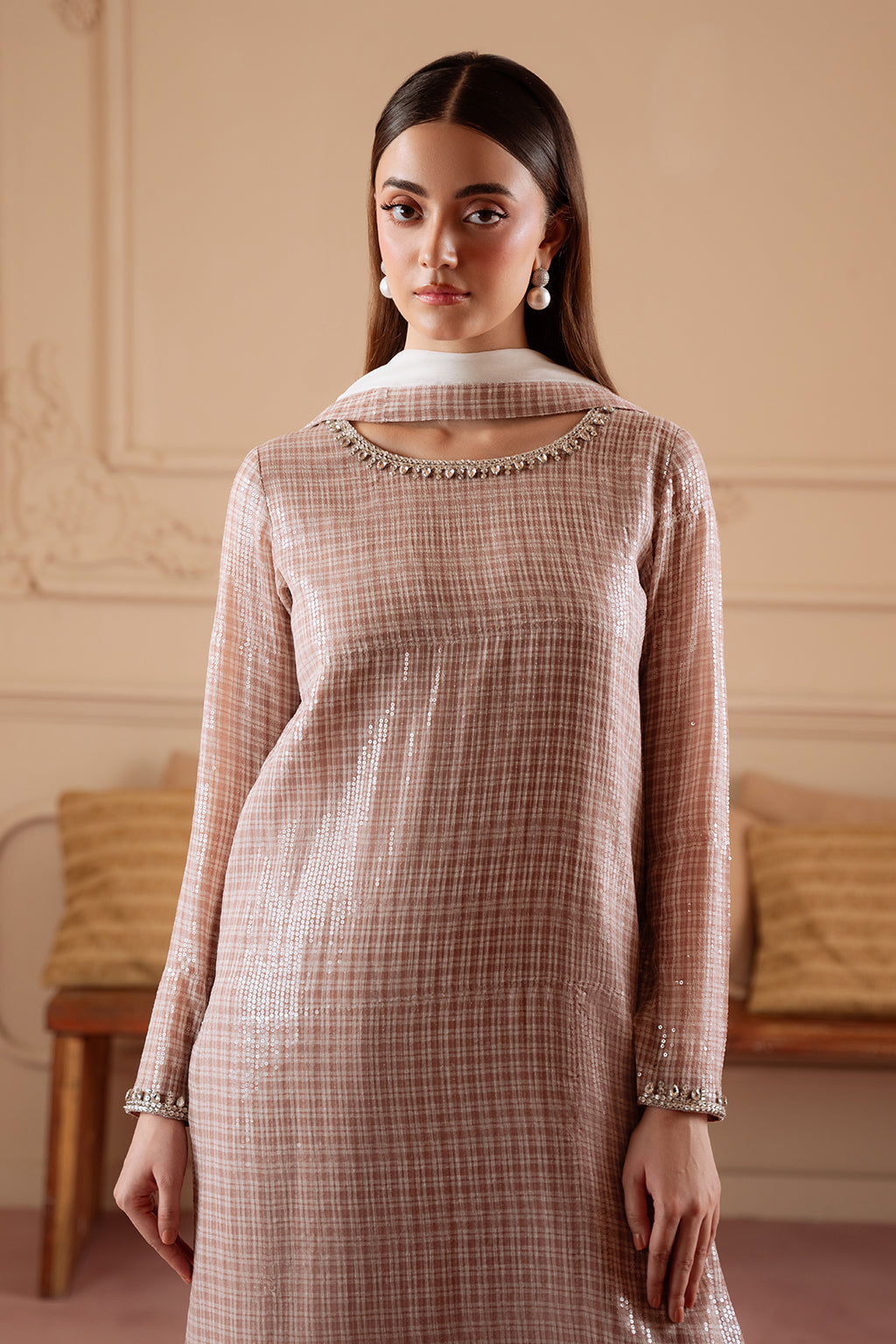 Perfect three-piece features fancy chiffon shirt with hand embellished neckline paired with rawsilk trouser and tie-dye chiffon dupatta