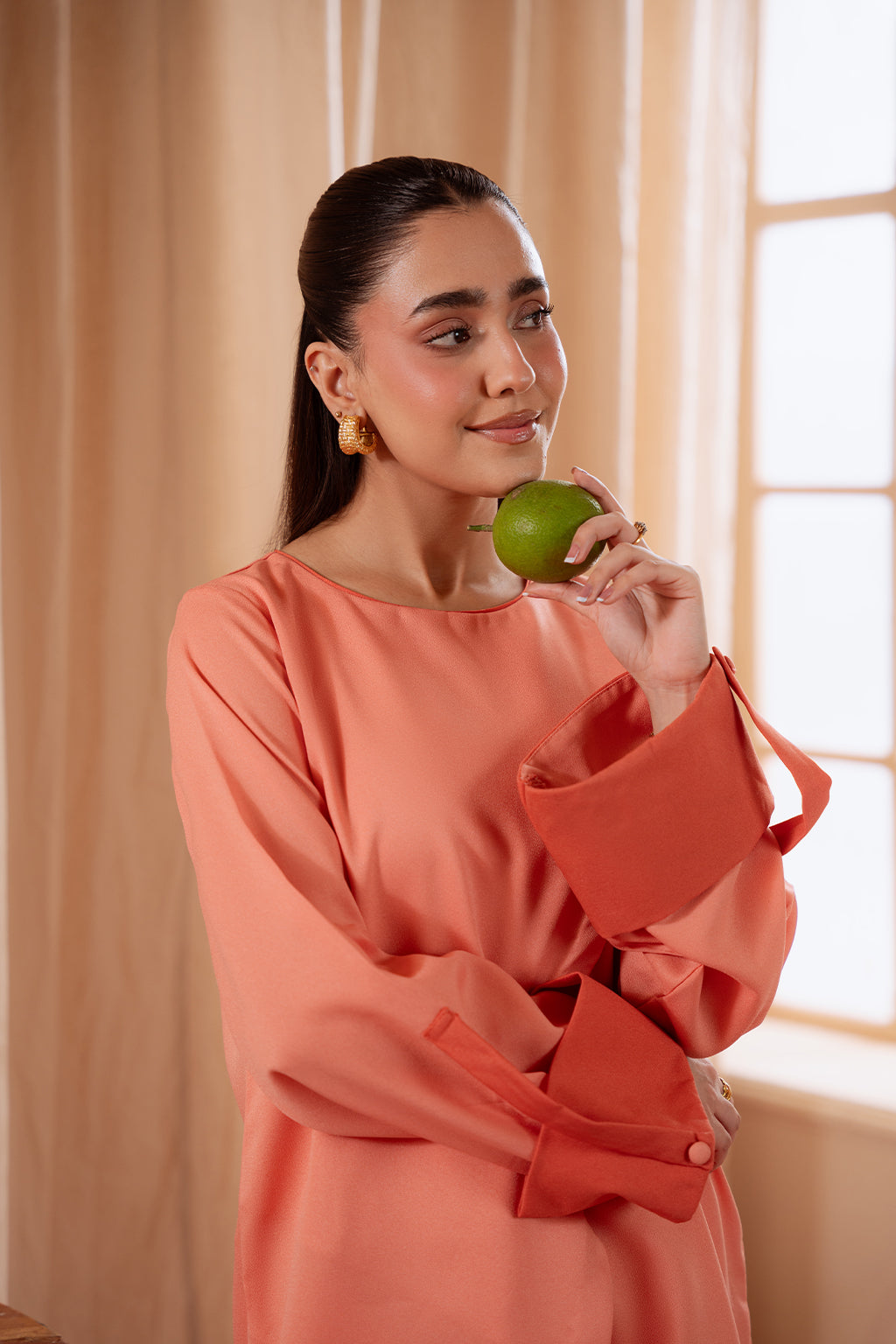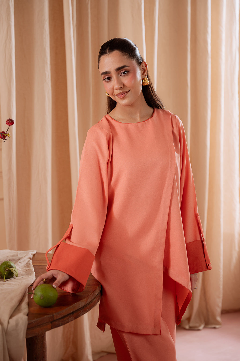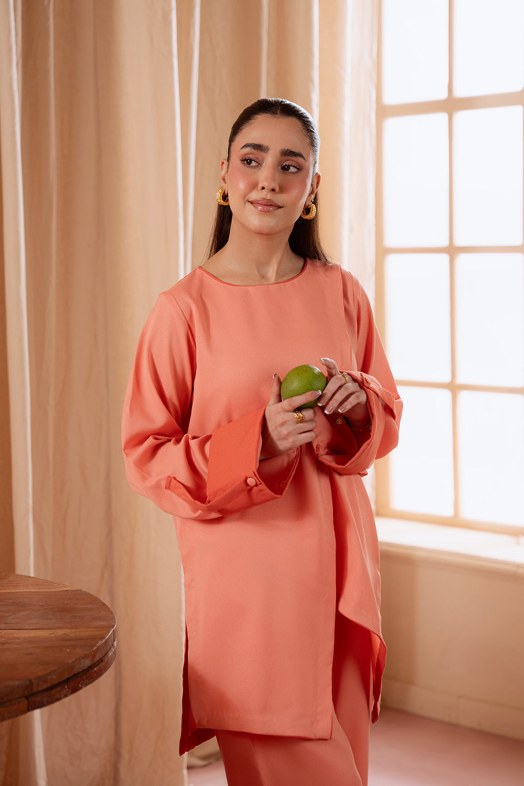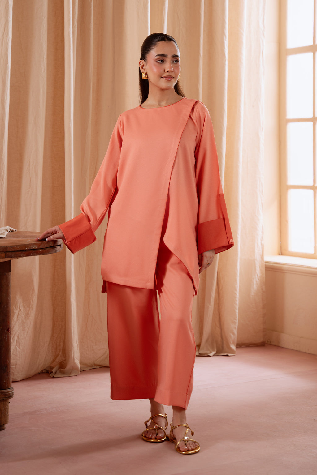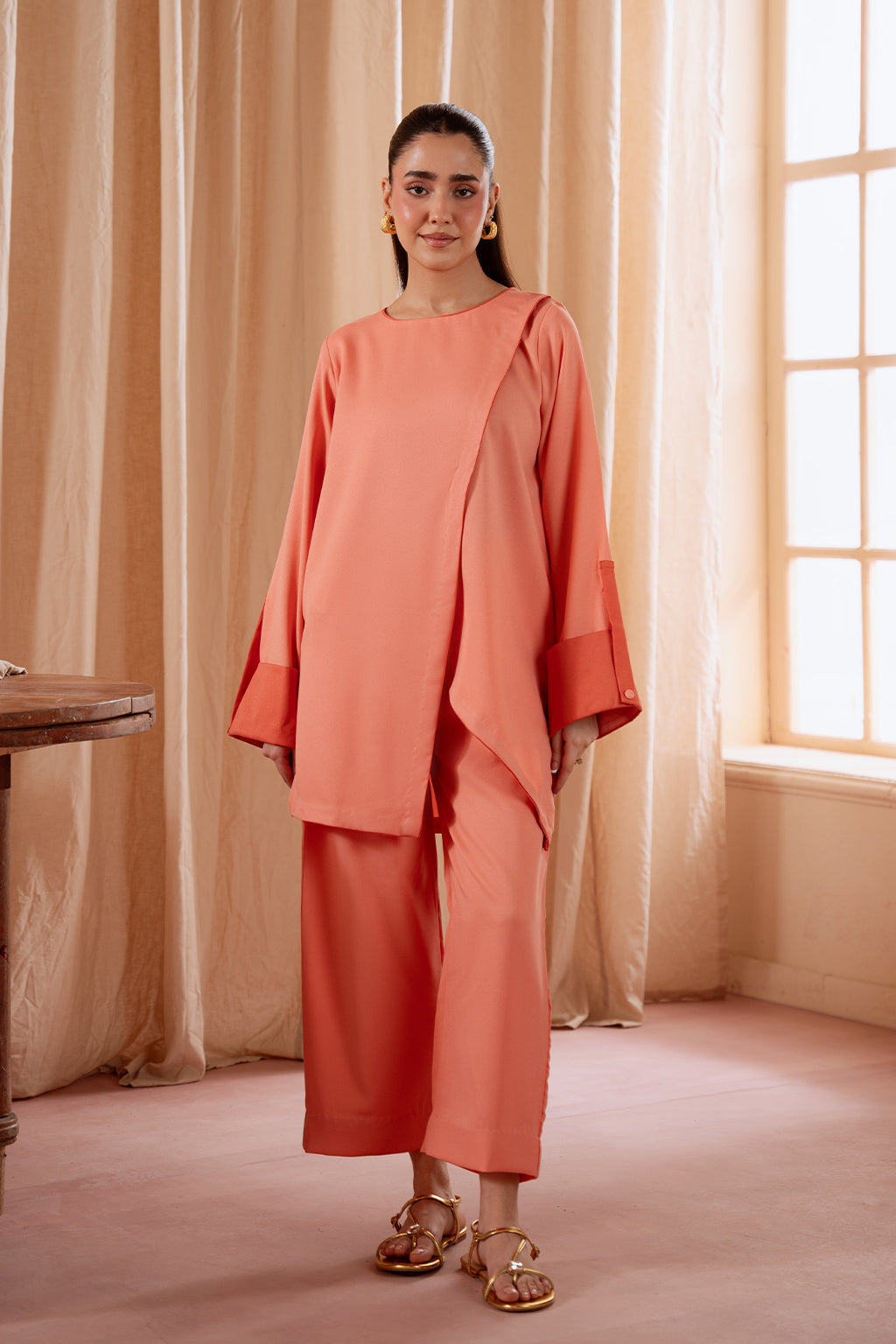 Elegant two piece featuring peach georgette shirt with georgette pants