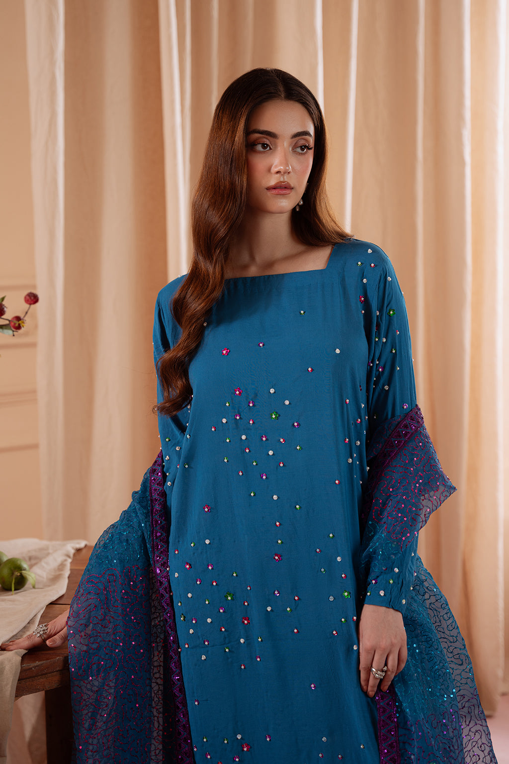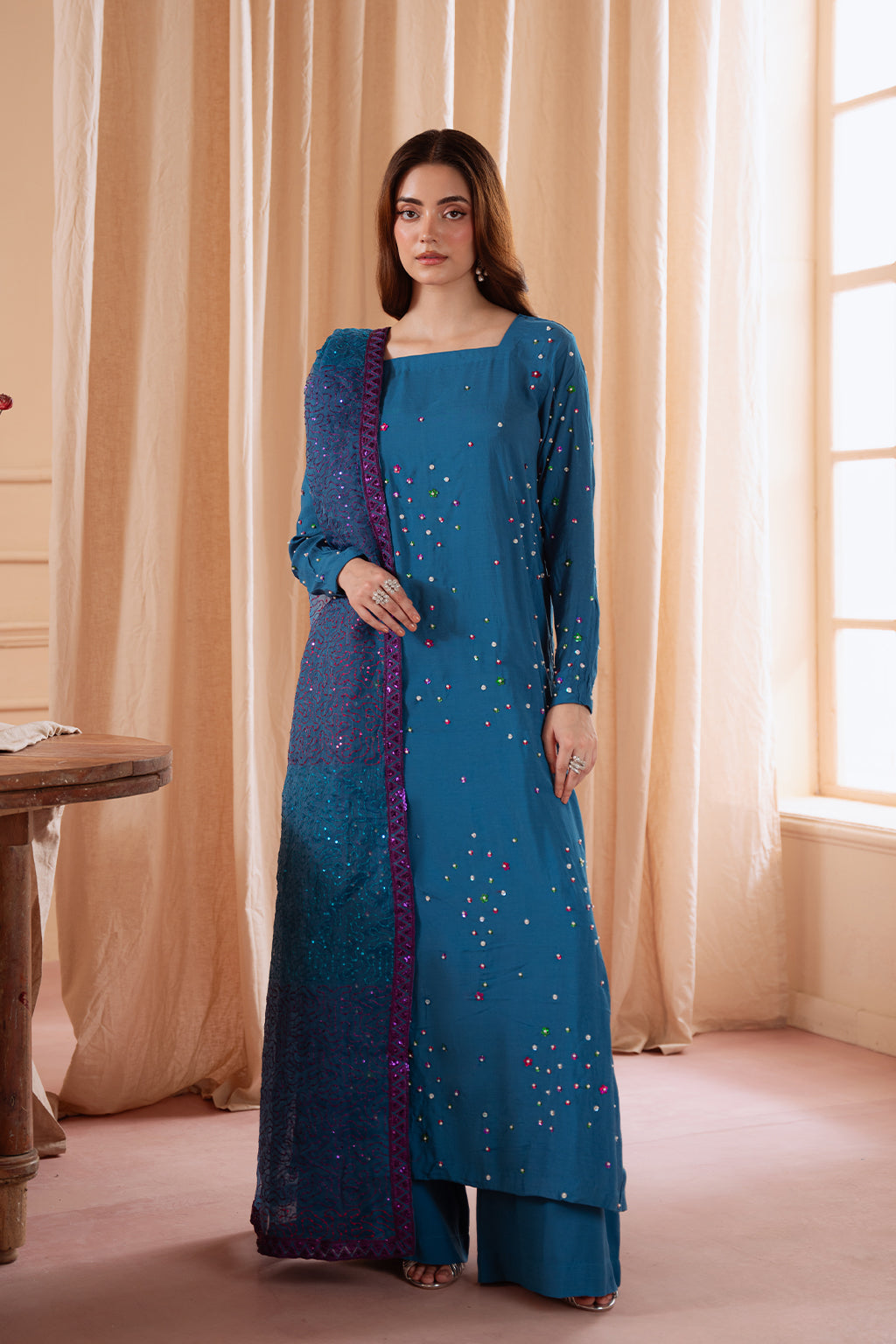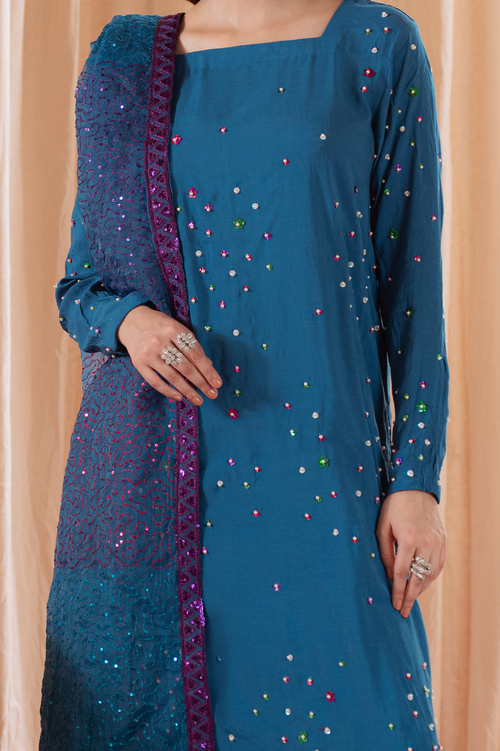 Embroidered and embellished rawsilk shirt paired embroidered organza dupatta and rawsilk trouser
