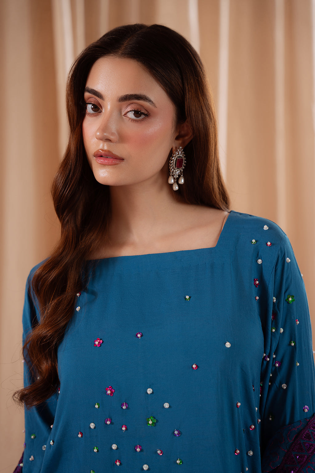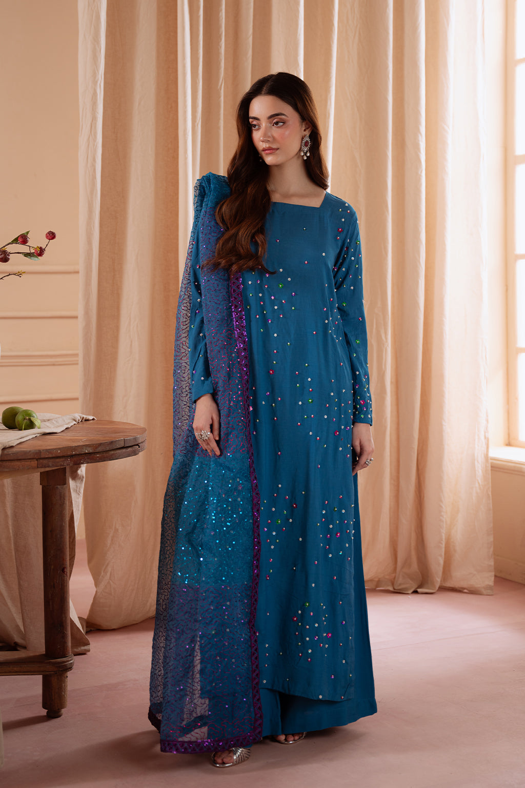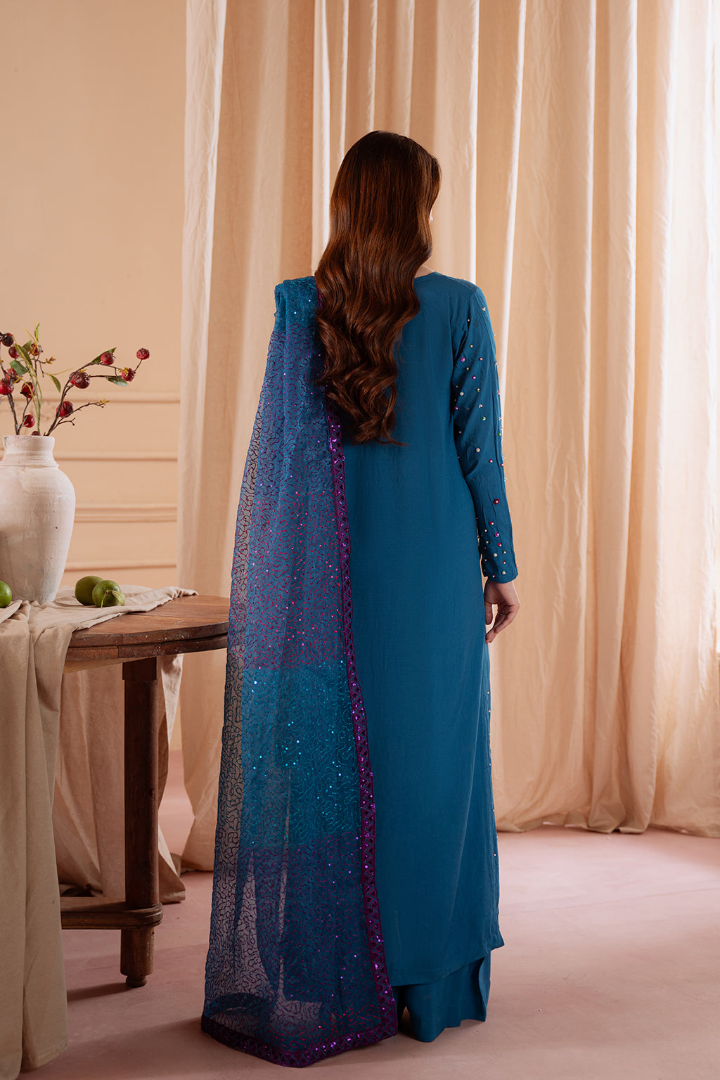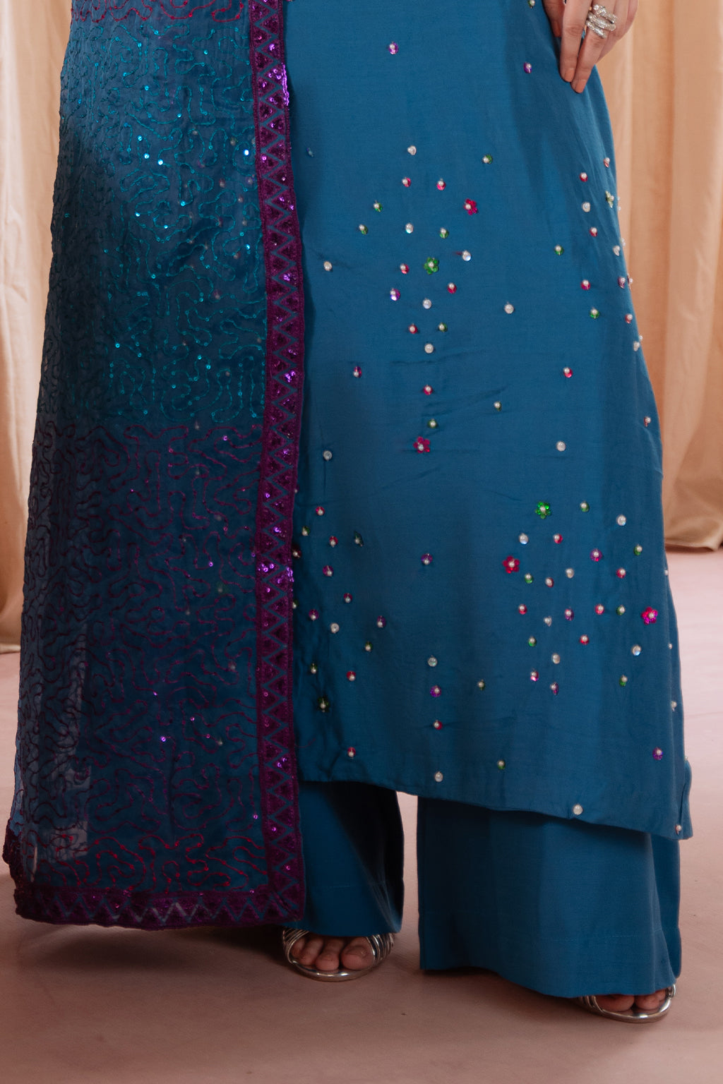 Embroidered and embellished rawsilk shirt paired embroidered organza dupatta and rawsilk trouser