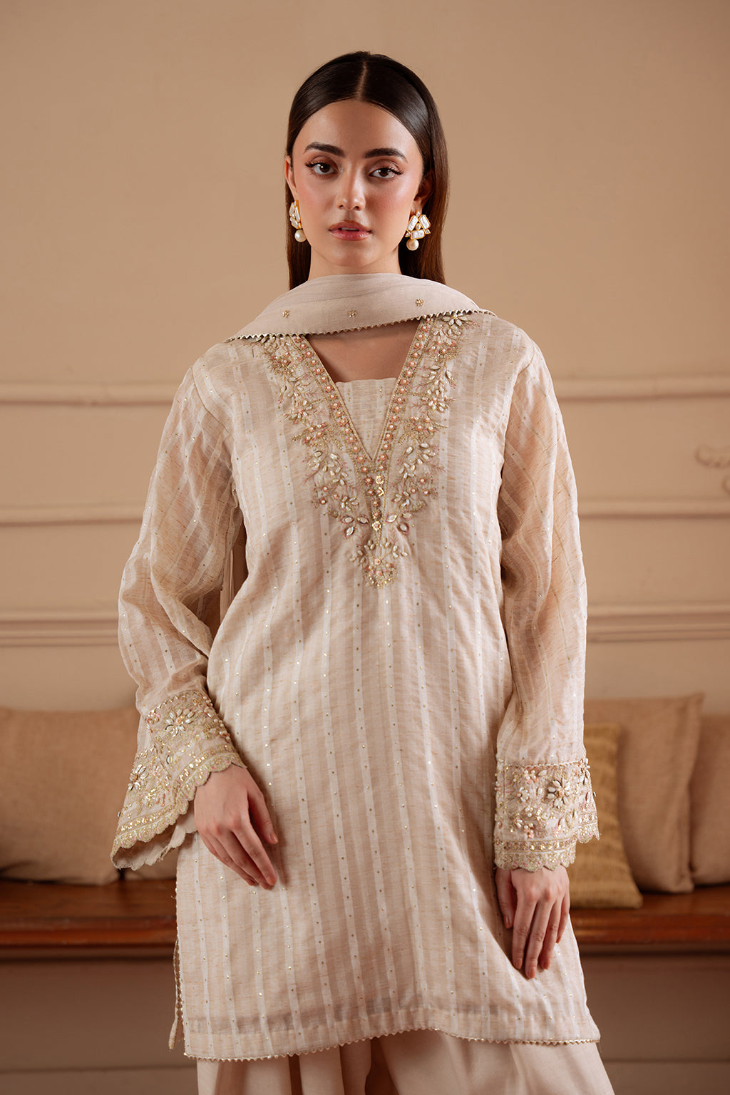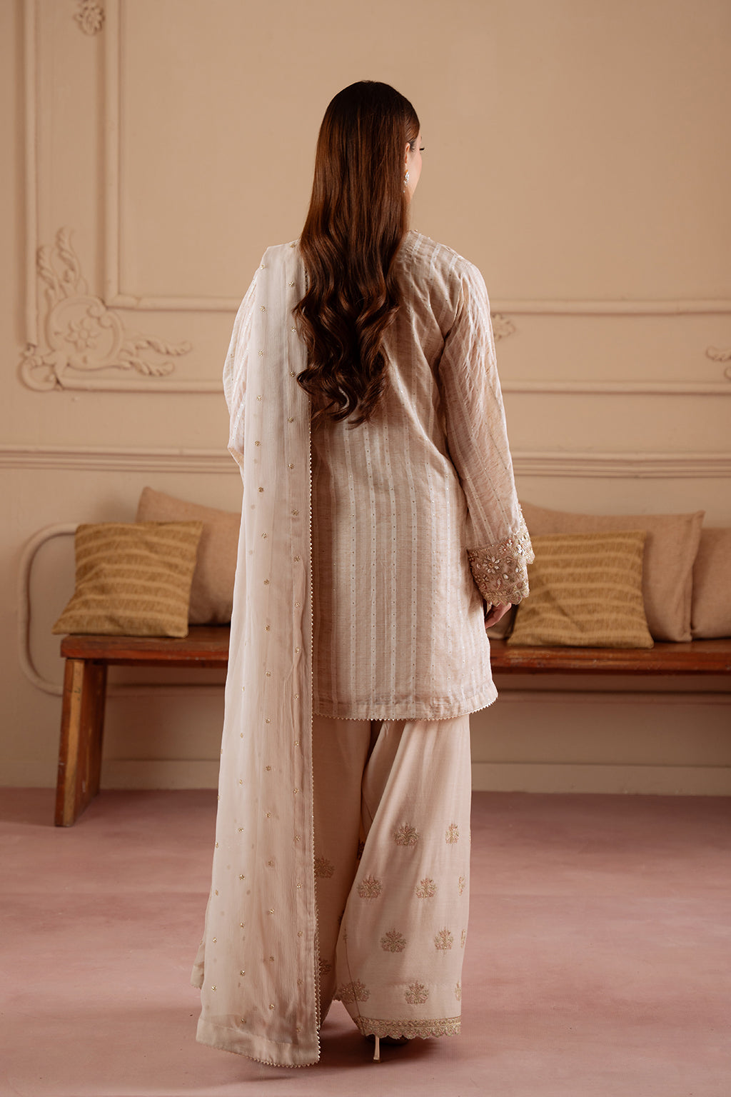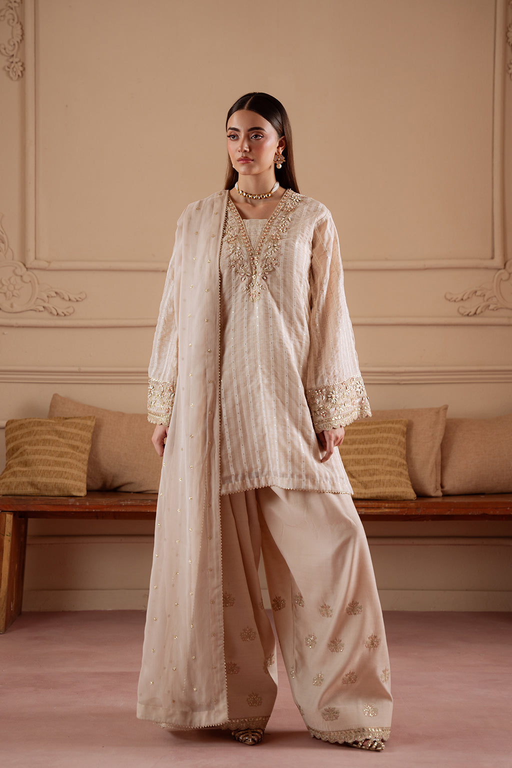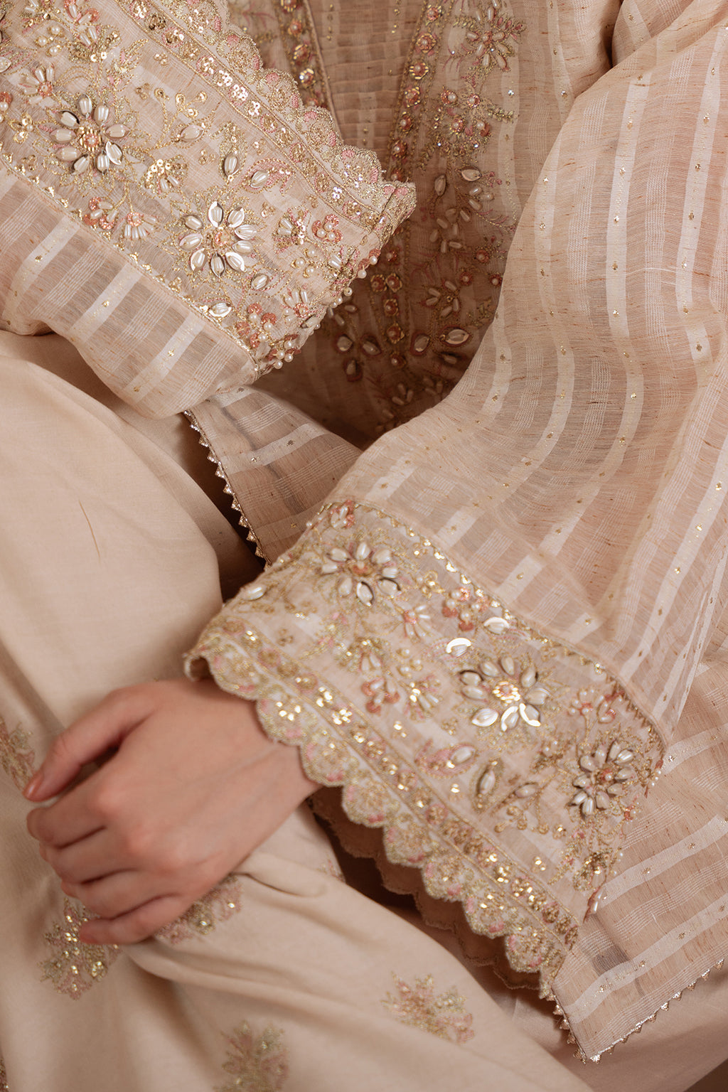 Embroidered and embellished zari brochia shirt paired with rawsilk trouser and embroidered chiffon dupatta