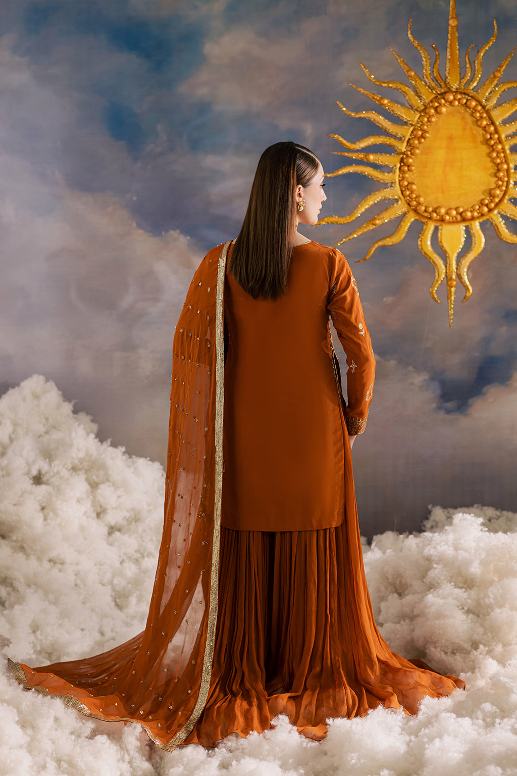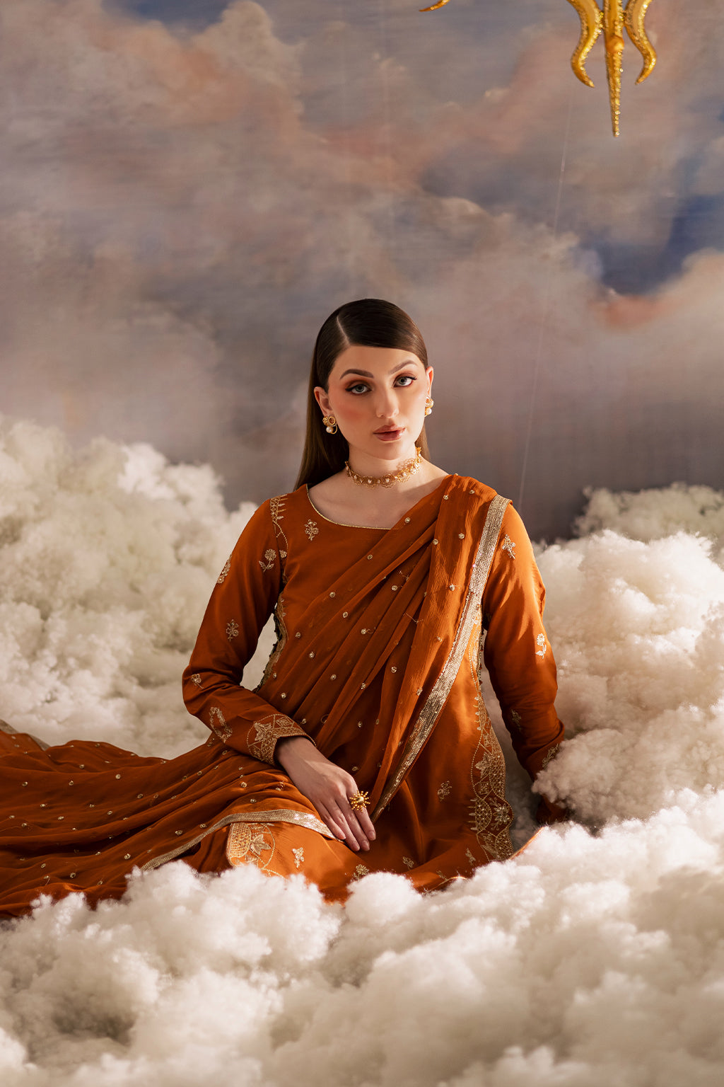 Embroidered silk shirt paired with chiffon crushed sharara pants and embroidered chiffon dupatta.