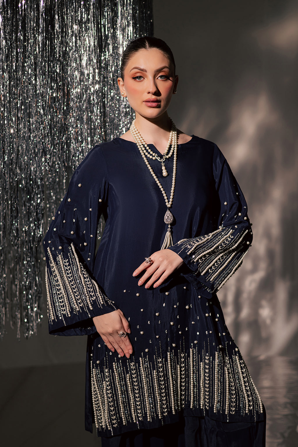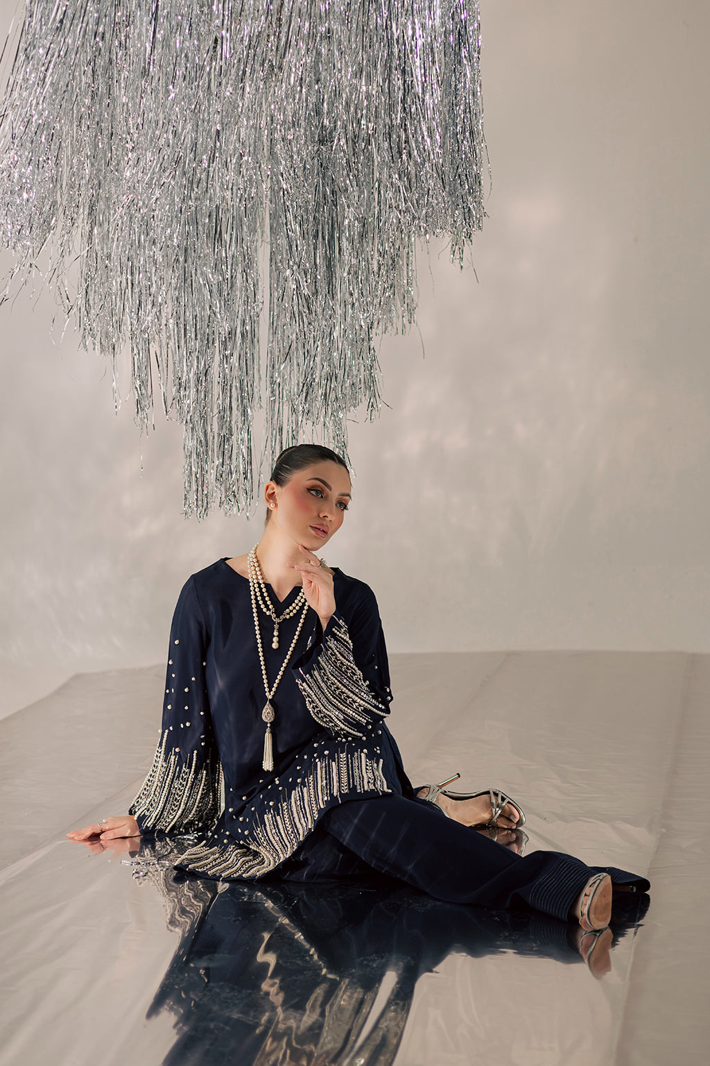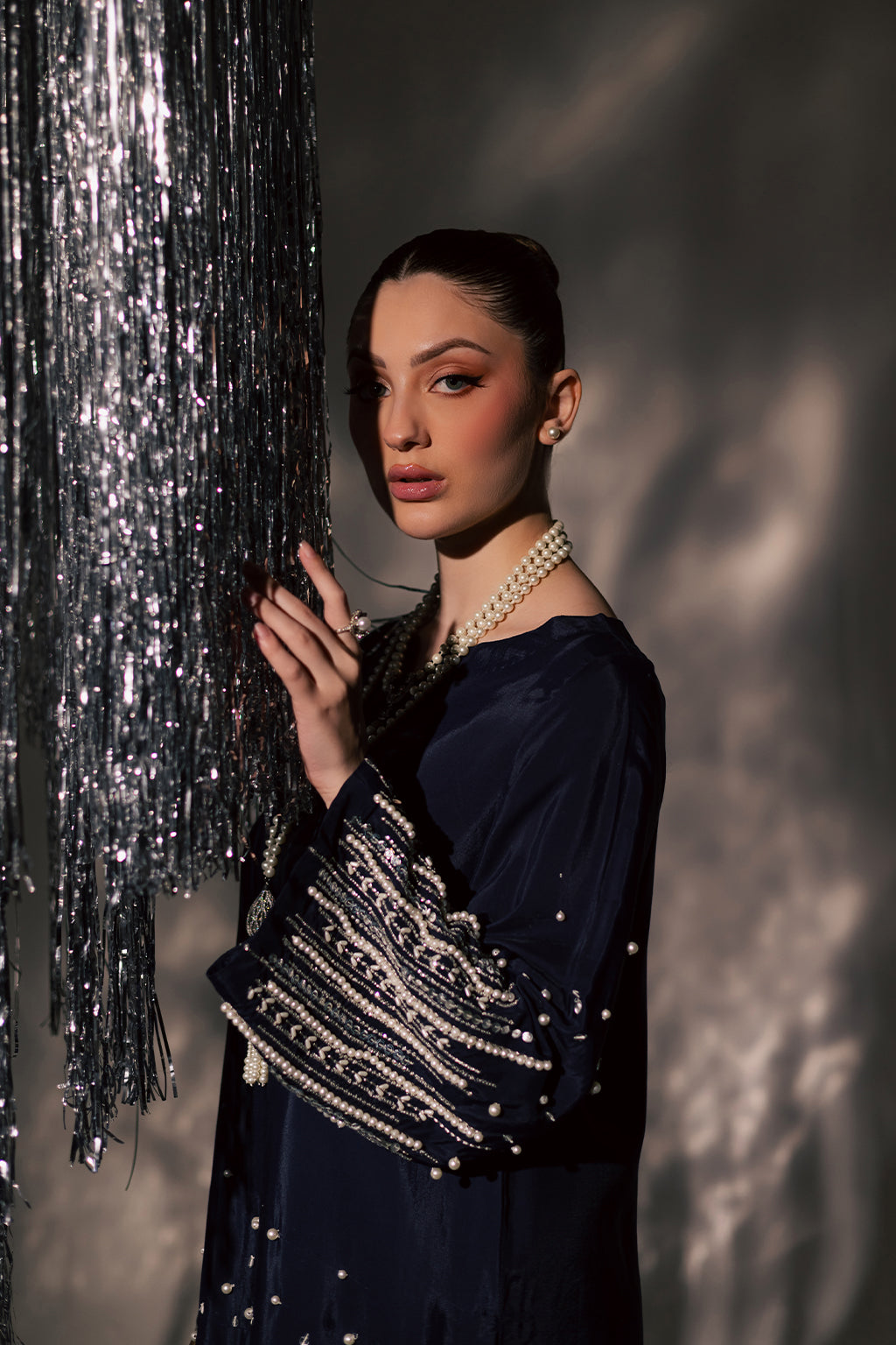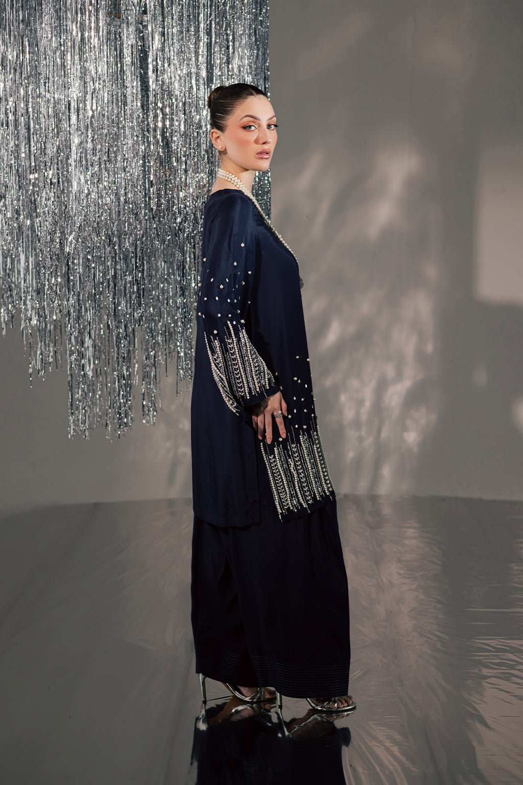 Chic Navy blue ensemble featuring a straight shirt with silver sequin and bead embellishments. Detailed cuffs and hemline add a striking sparkle, paired with farshi shalwar for elegance