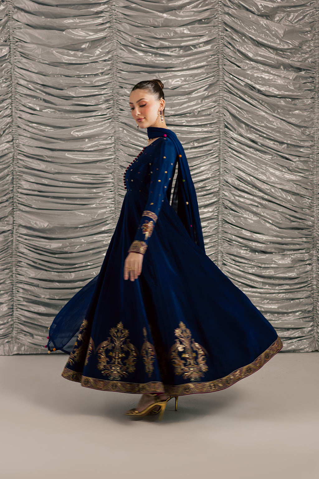 Embroidered silk frock paired with silk pants and embroidered chiffon dupatta