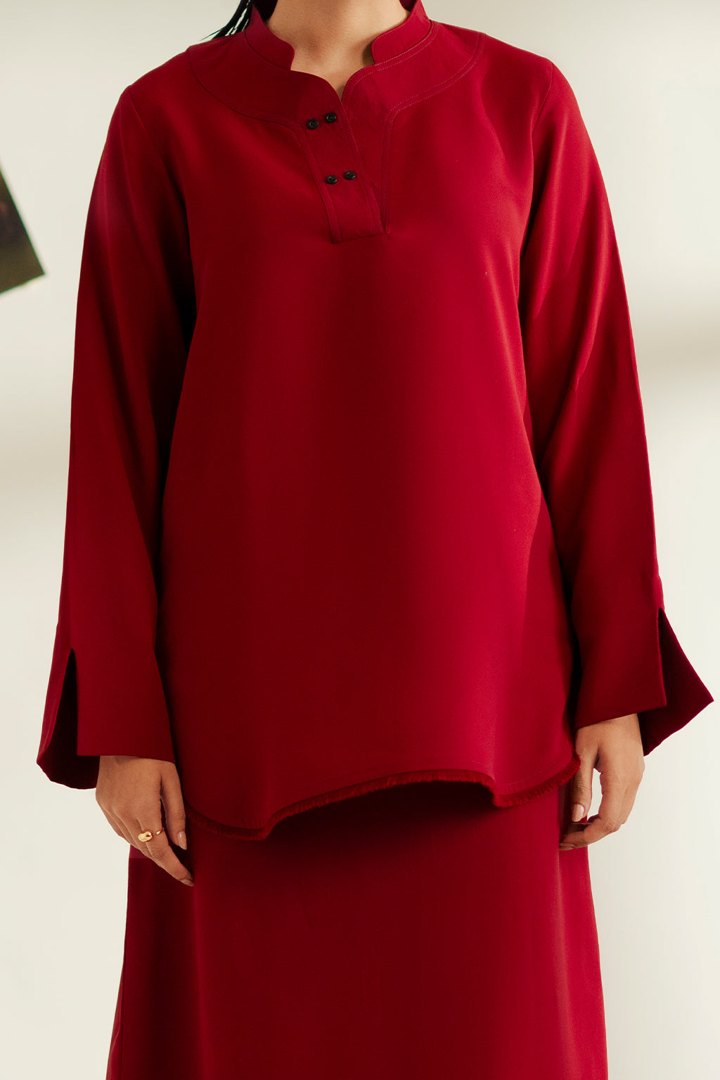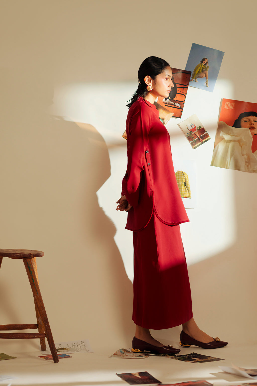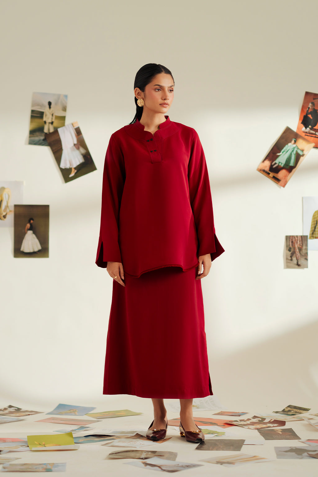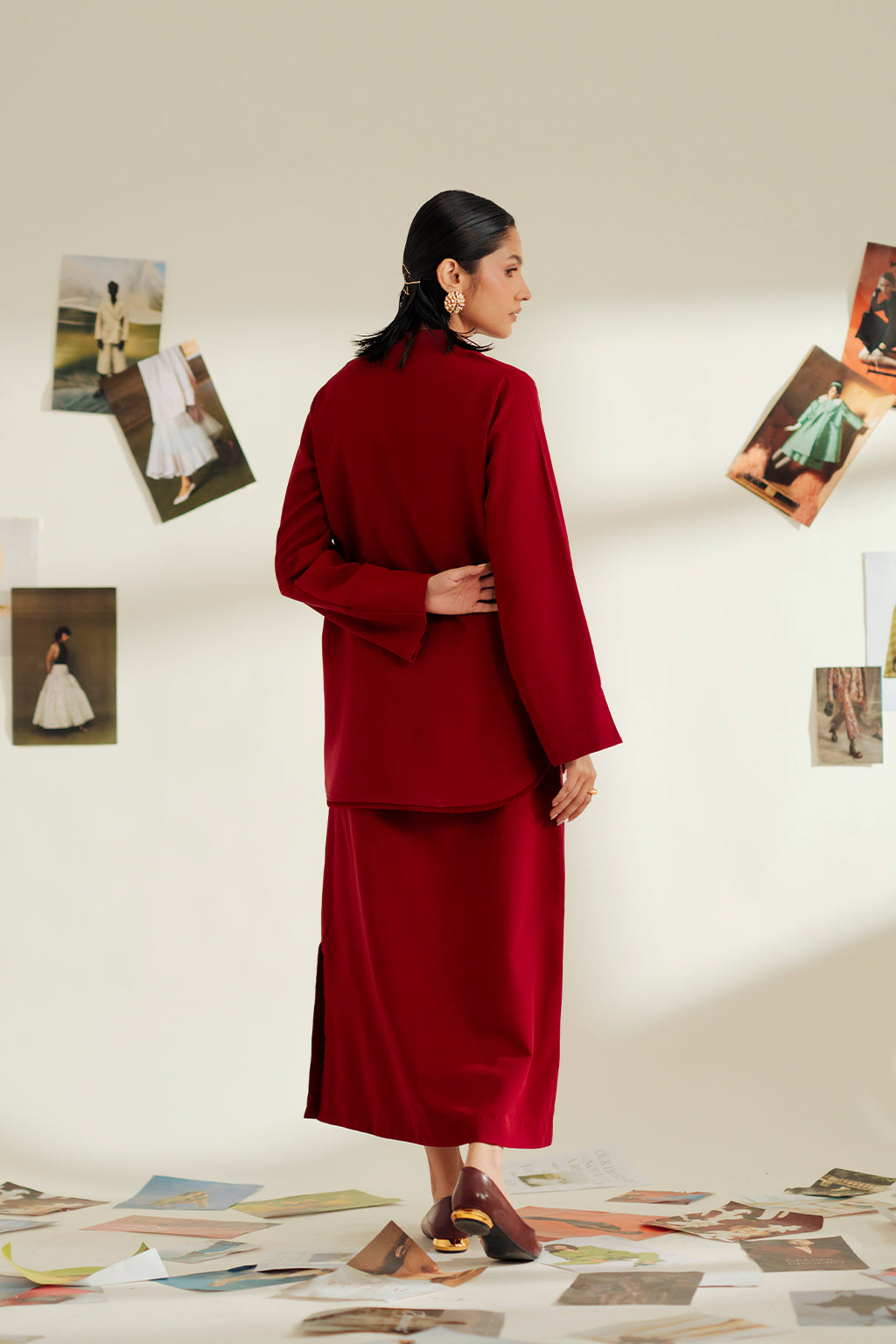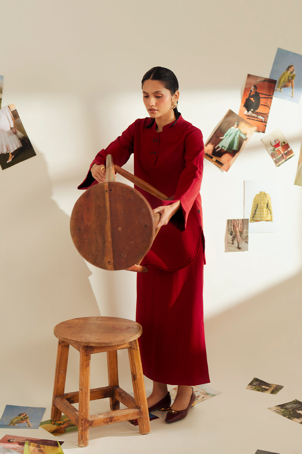 A bold red georgette CO-ORD featuring a long straight kurta with a mandarin neckline and subtle button detailing, paired with a matching ankle-length skirt. The clean lines and structured silhouette give it a modern yet graceful appeal.