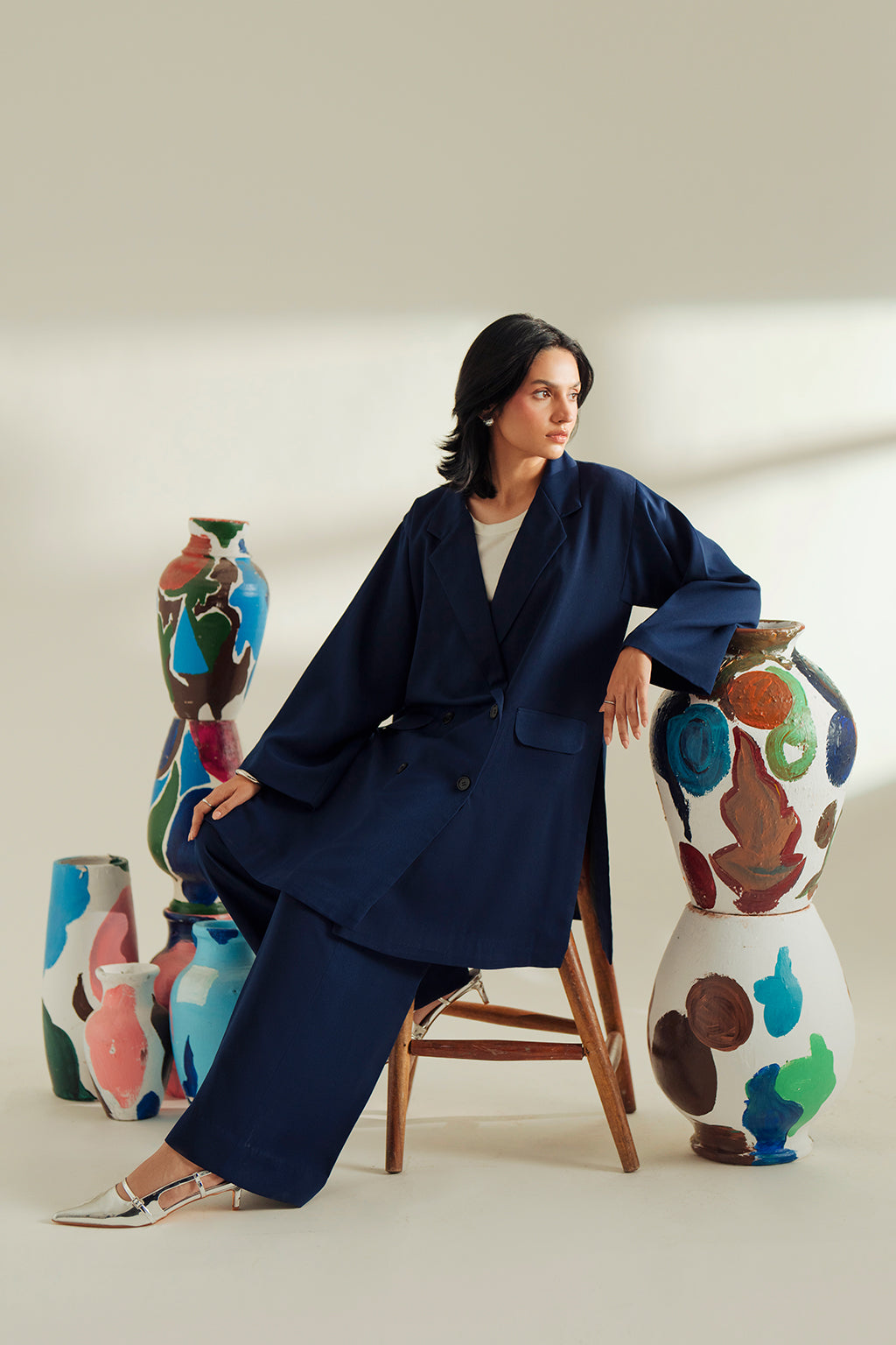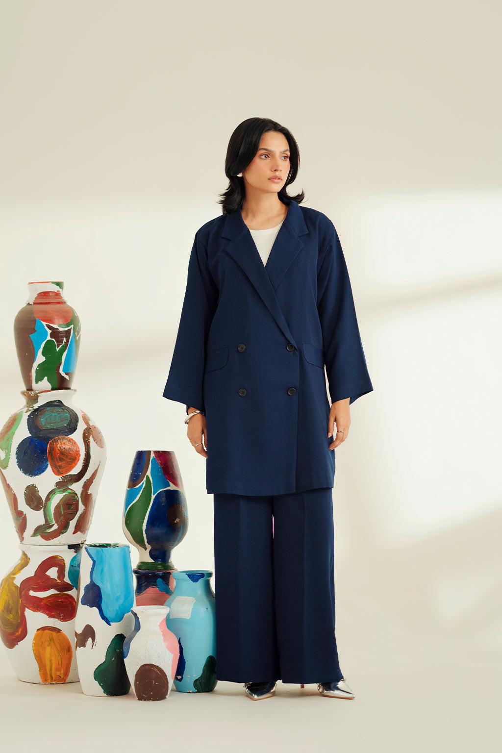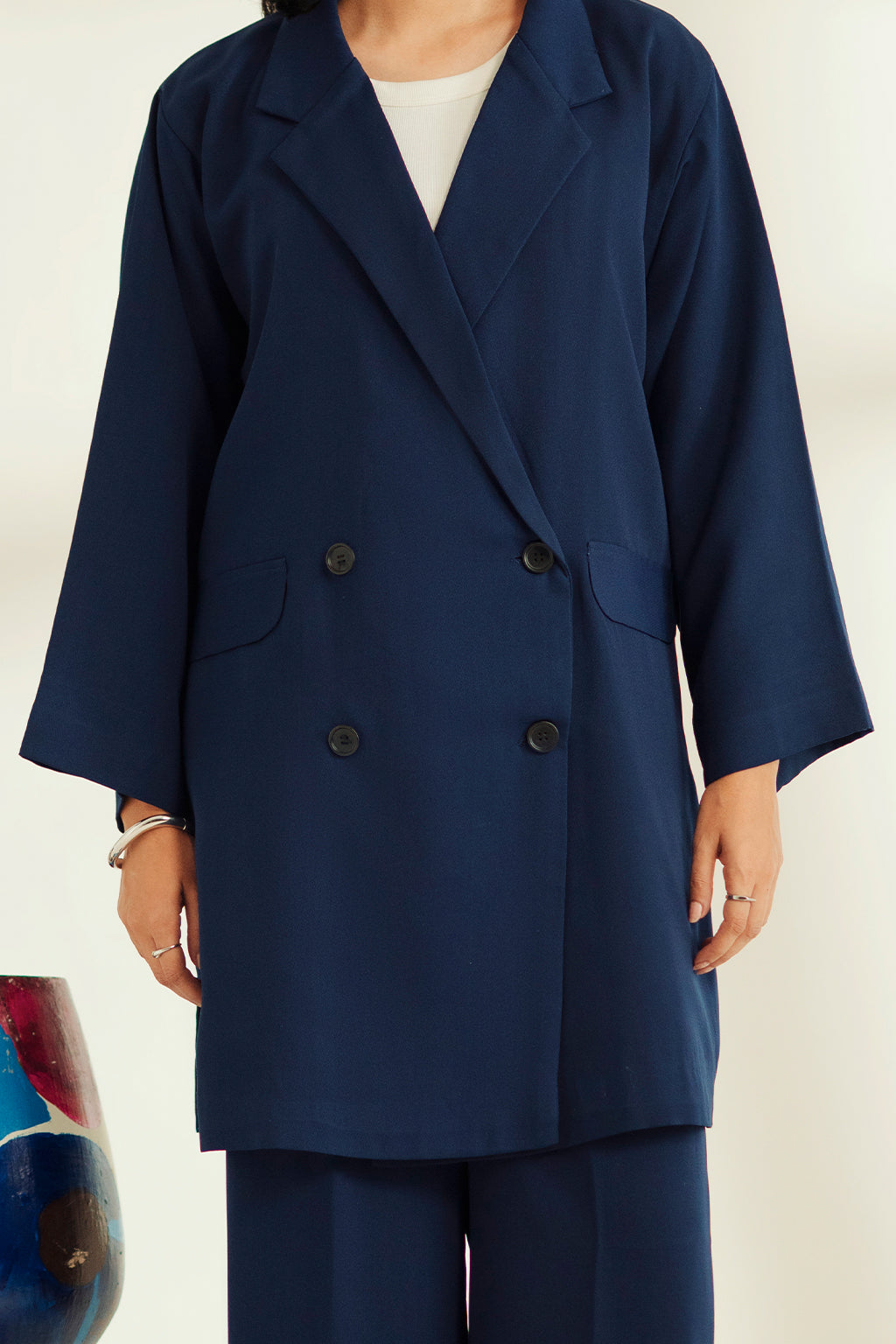 This is a relaxed-fit navy blue georgette CO-ORD set featuring an oversized blazer with dropped shoulders and a double-breasted button detail. It's paired with wide-leg trousers.