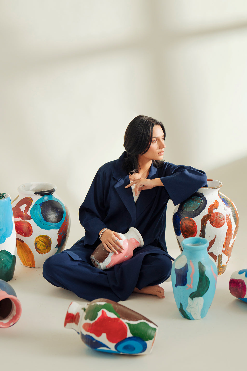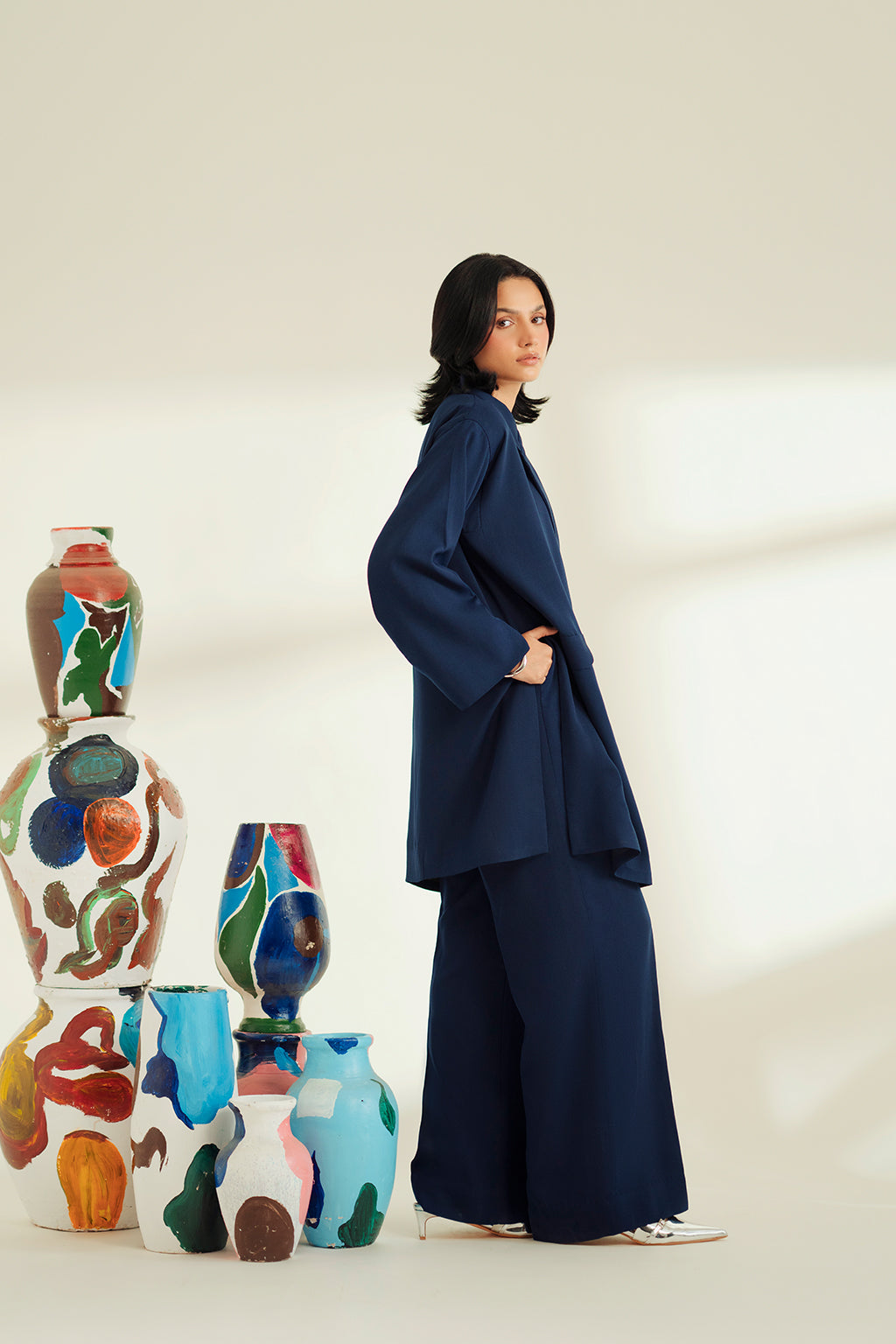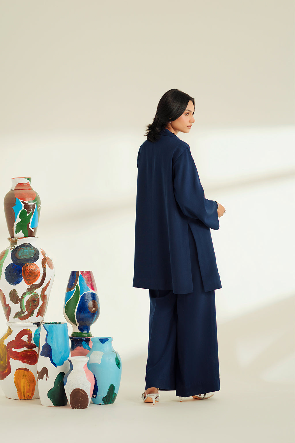 This is a relaxed-fit navy blue georgette CO-ORD set featuring an oversized blazer with dropped shoulders and a double-breasted button detail. It's paired with wide-leg trousers.
