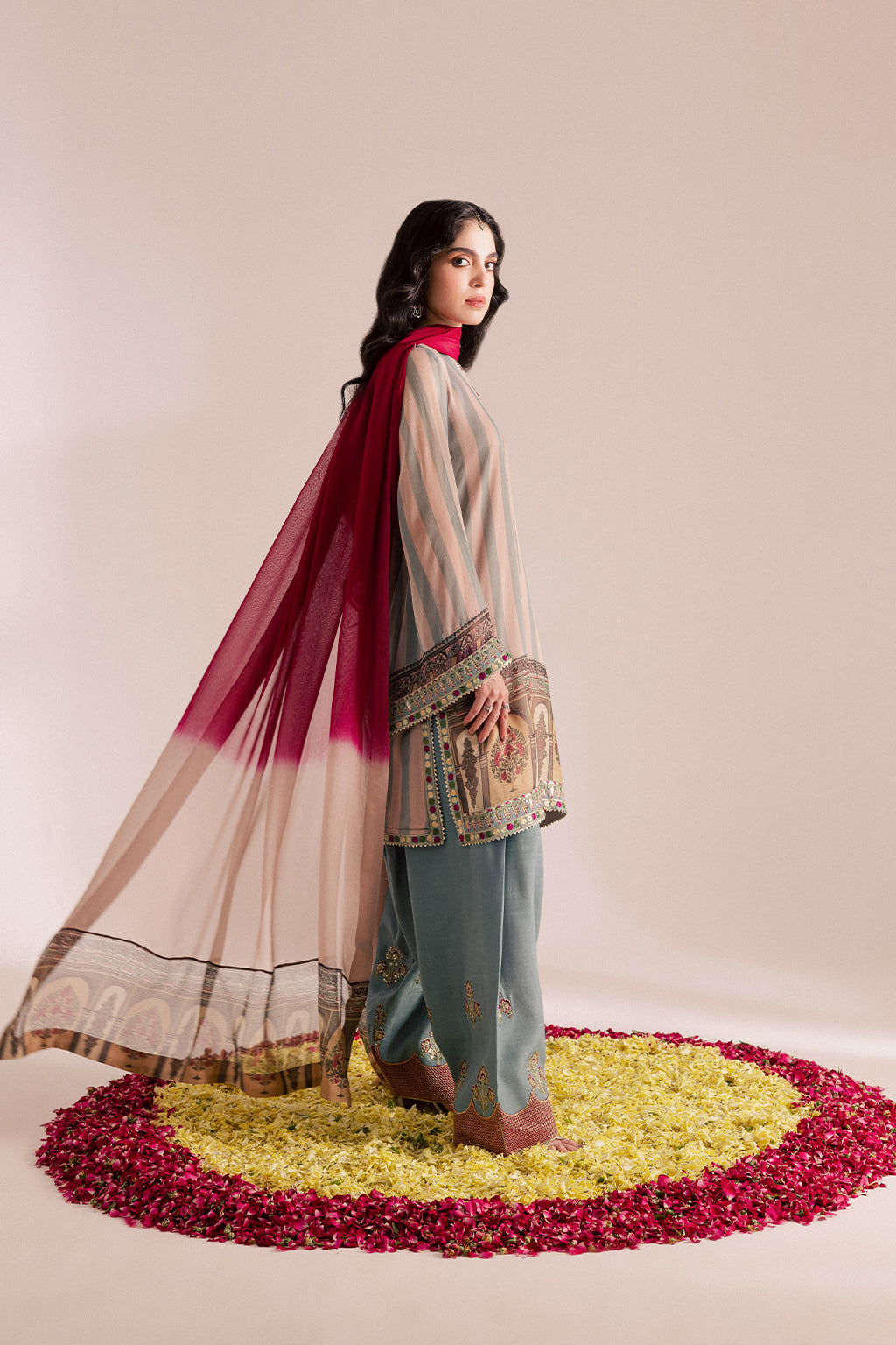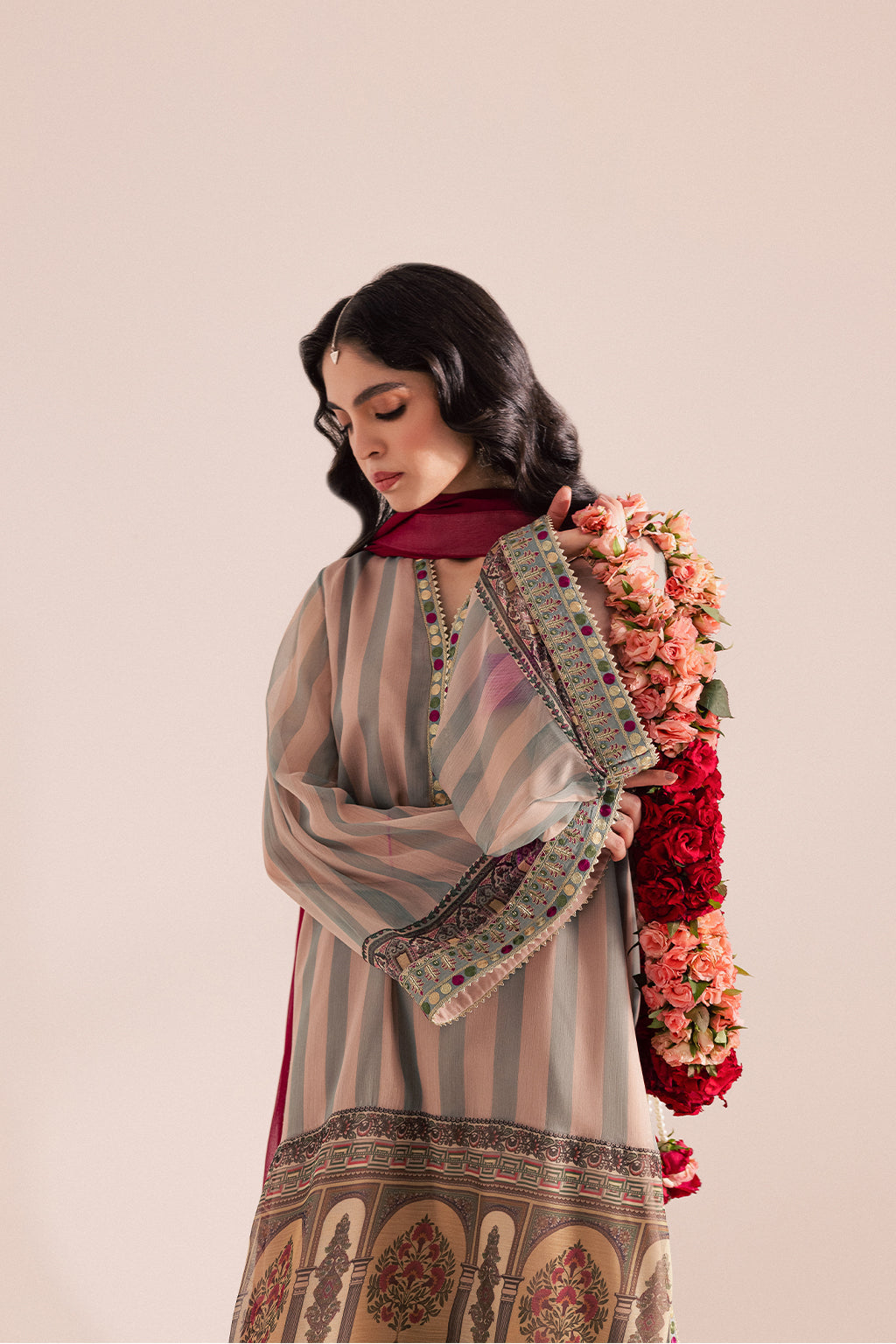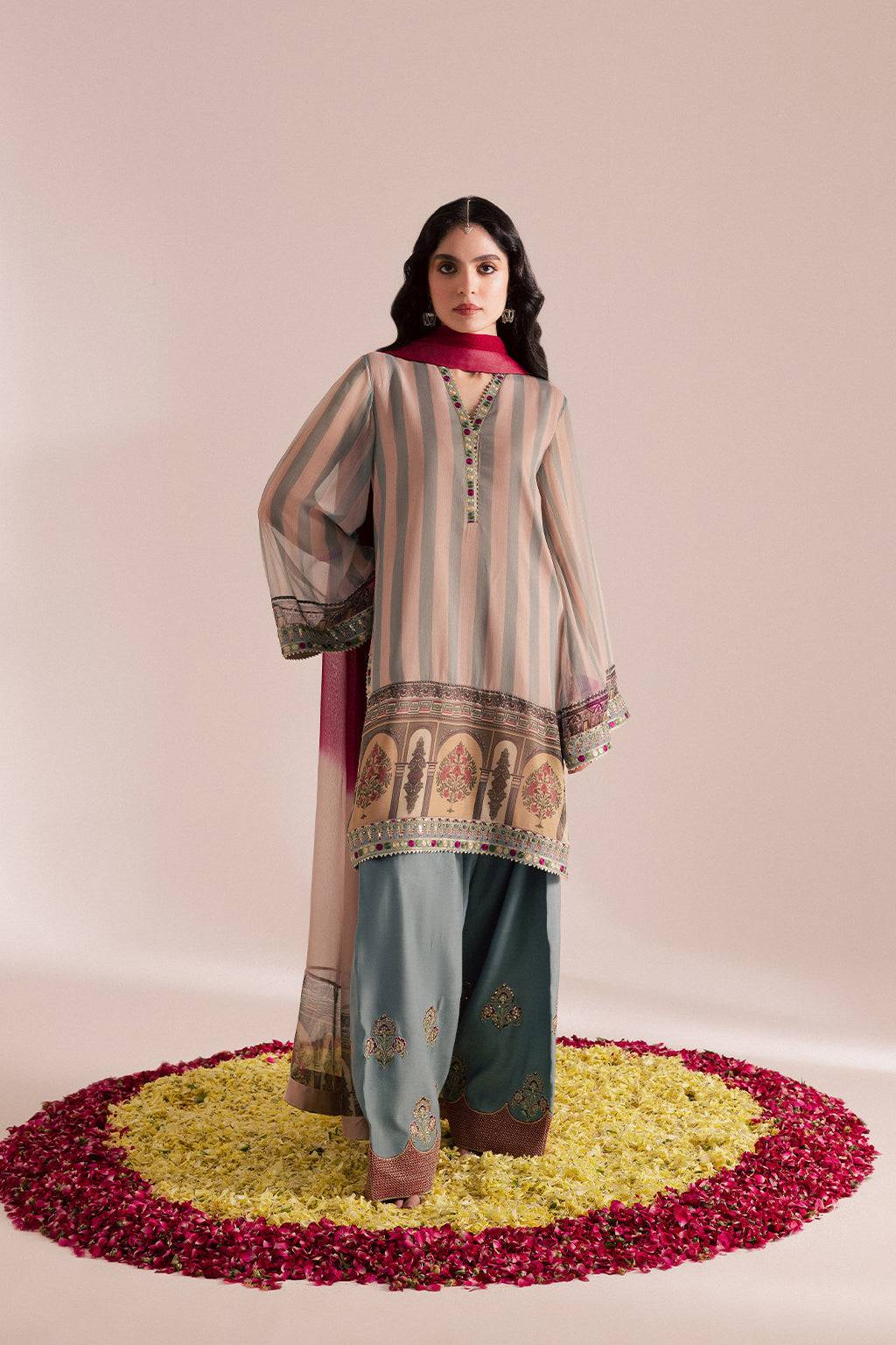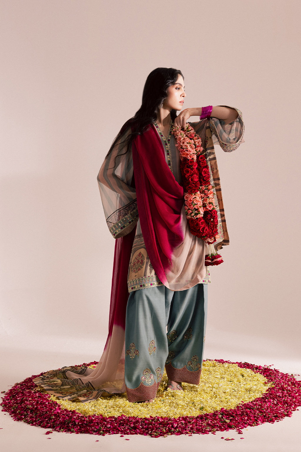 Printed chiffon shirt with embroidered details, paired with a printed chiffon dupatta and embroidered raw silk farshi shalwar