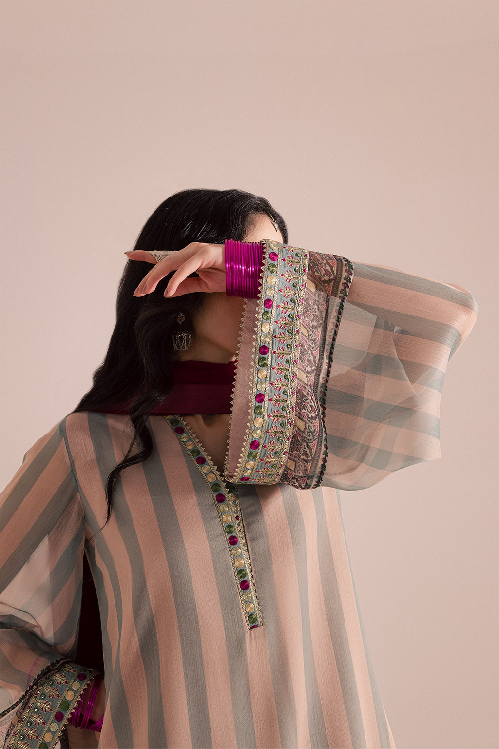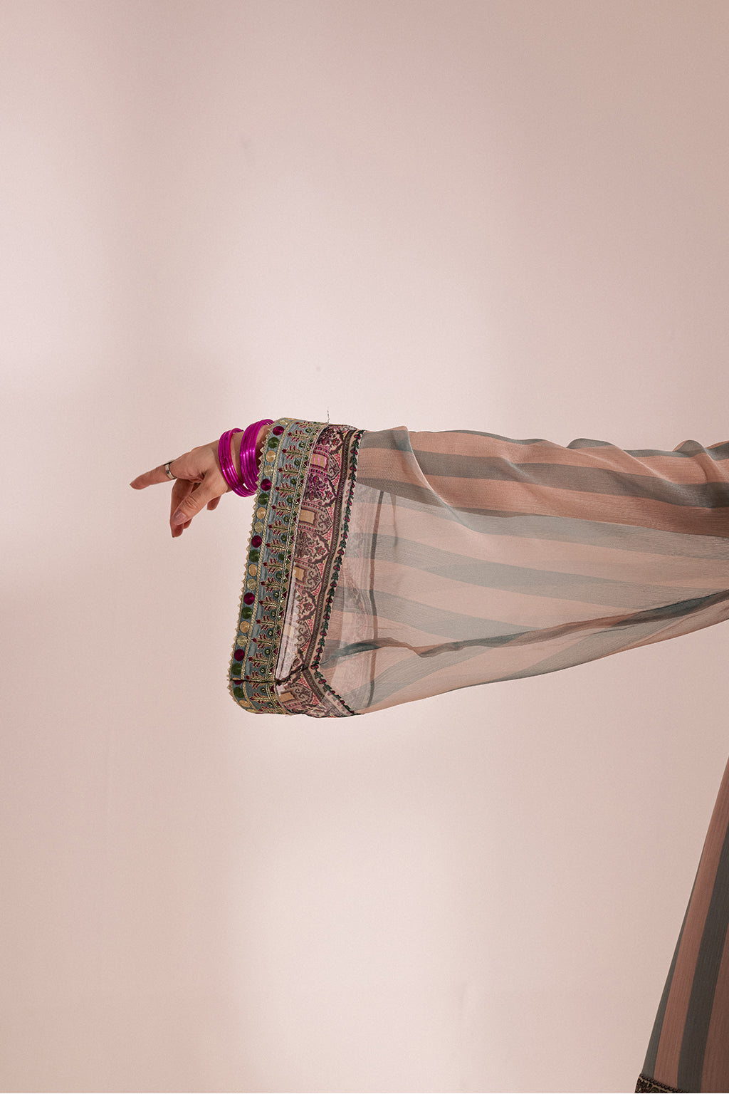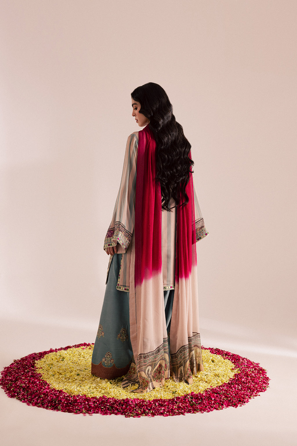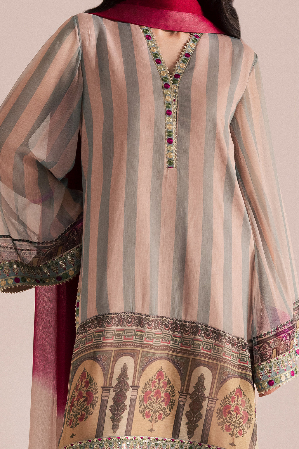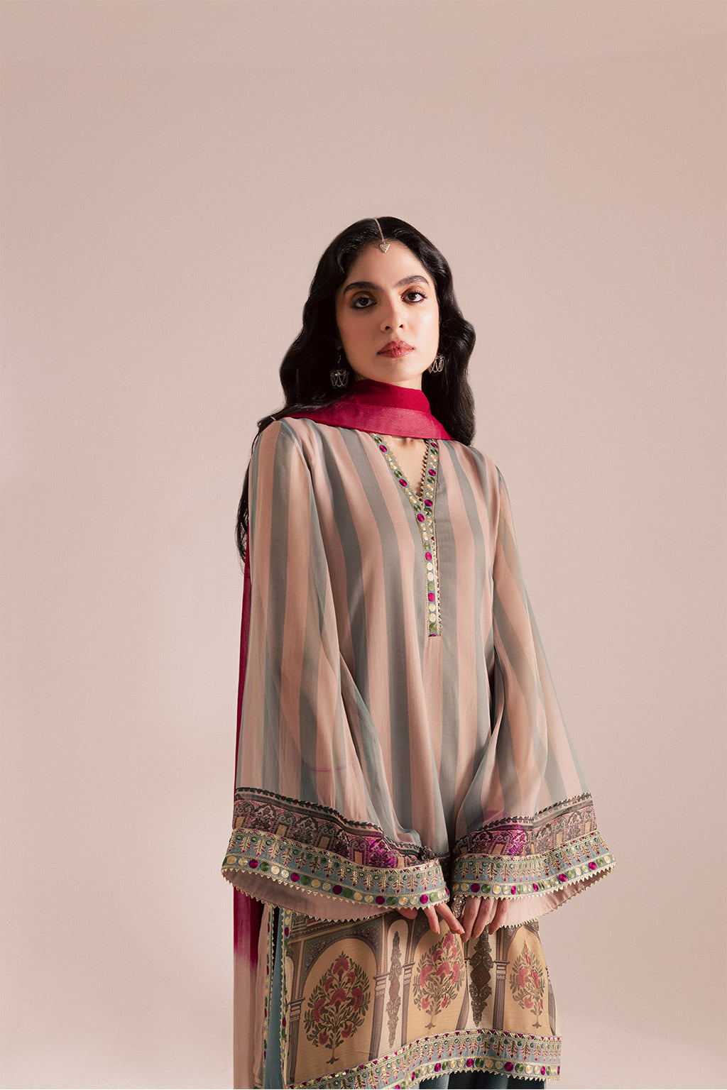 Printed chiffon shirt with embroidered details, paired with a printed chiffon dupatta and embroidered raw silk farshi shalwar