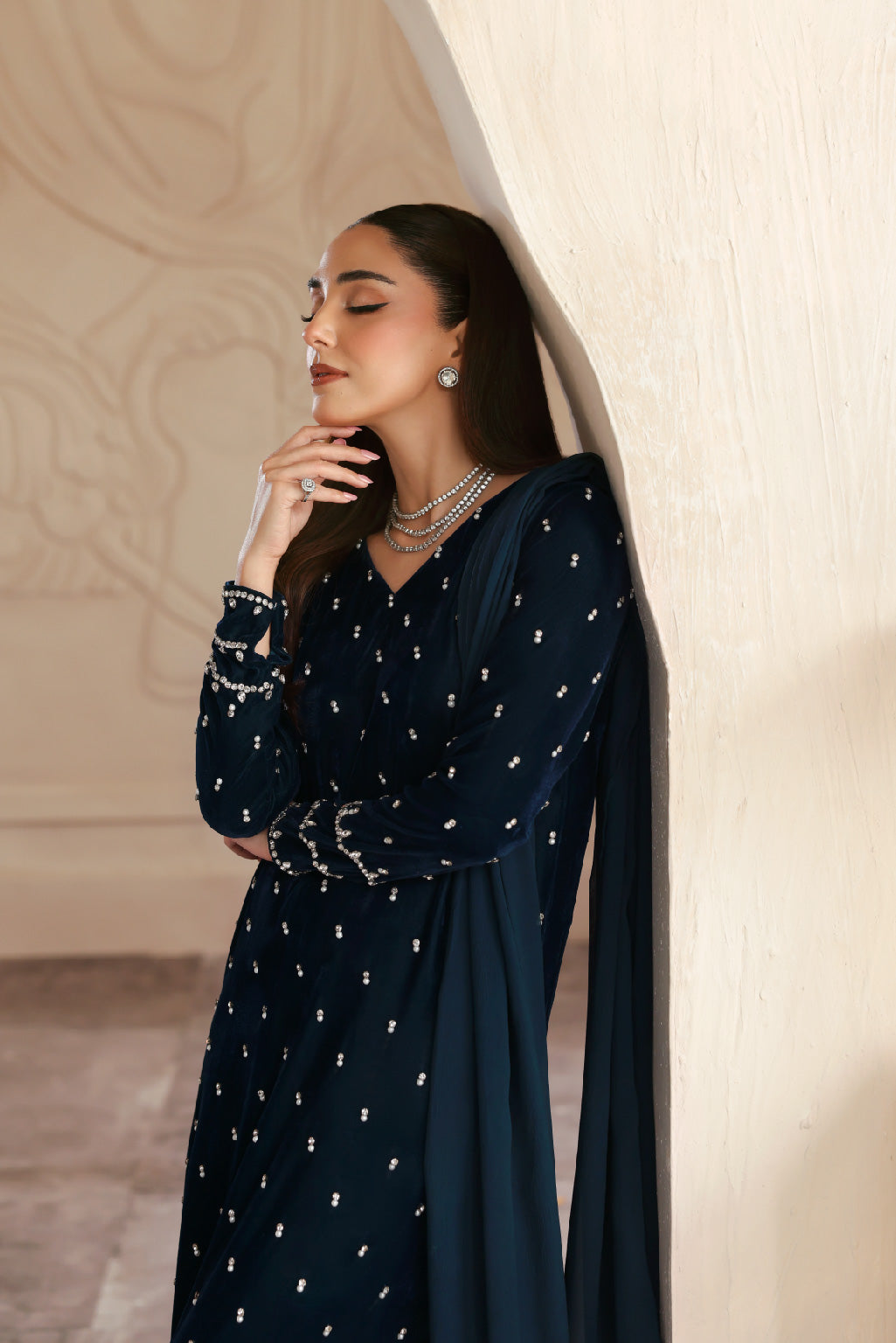 midnight blue velvet long shirt with intricate embellishments, paired with raw silk cigarette pants and a chiffon dupatta adorned with pearl hangings.