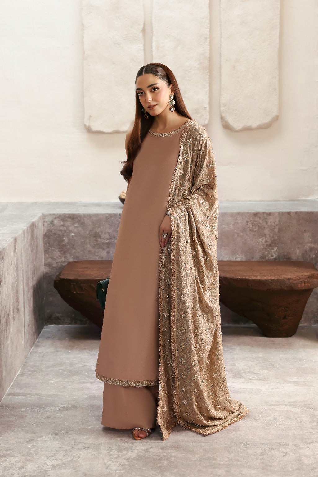 A luxe beige-gold embellished shawl styled with a raw silk long shirt adorned with intricate embroidered borders and tassels, paired gracefully with raw silk trousers.