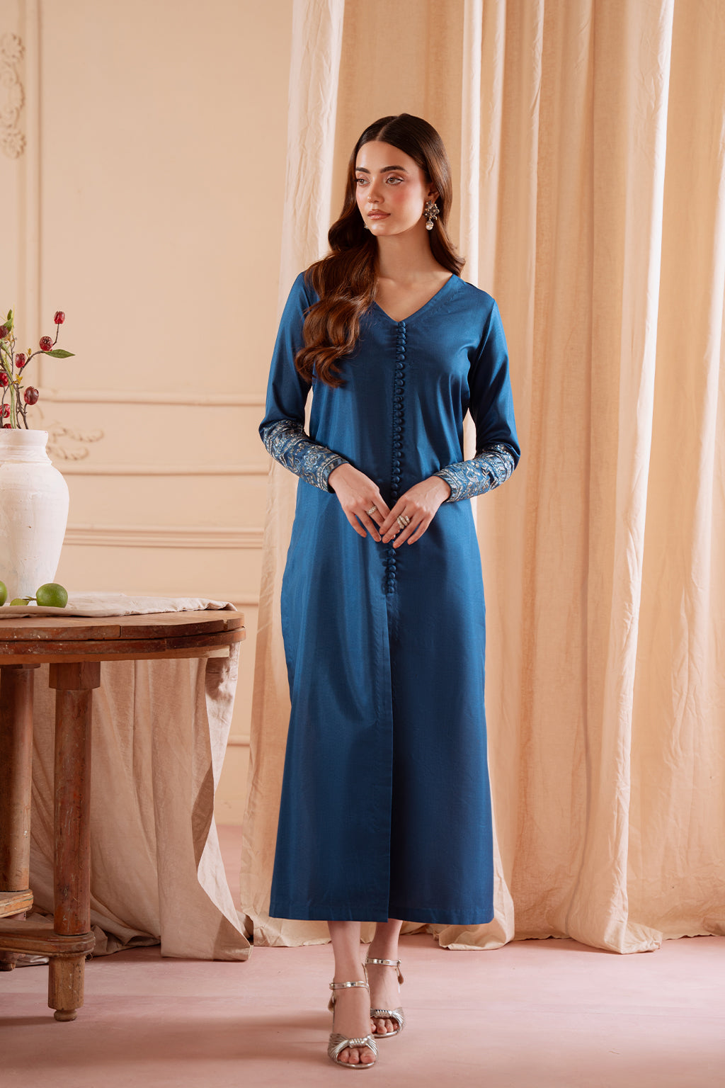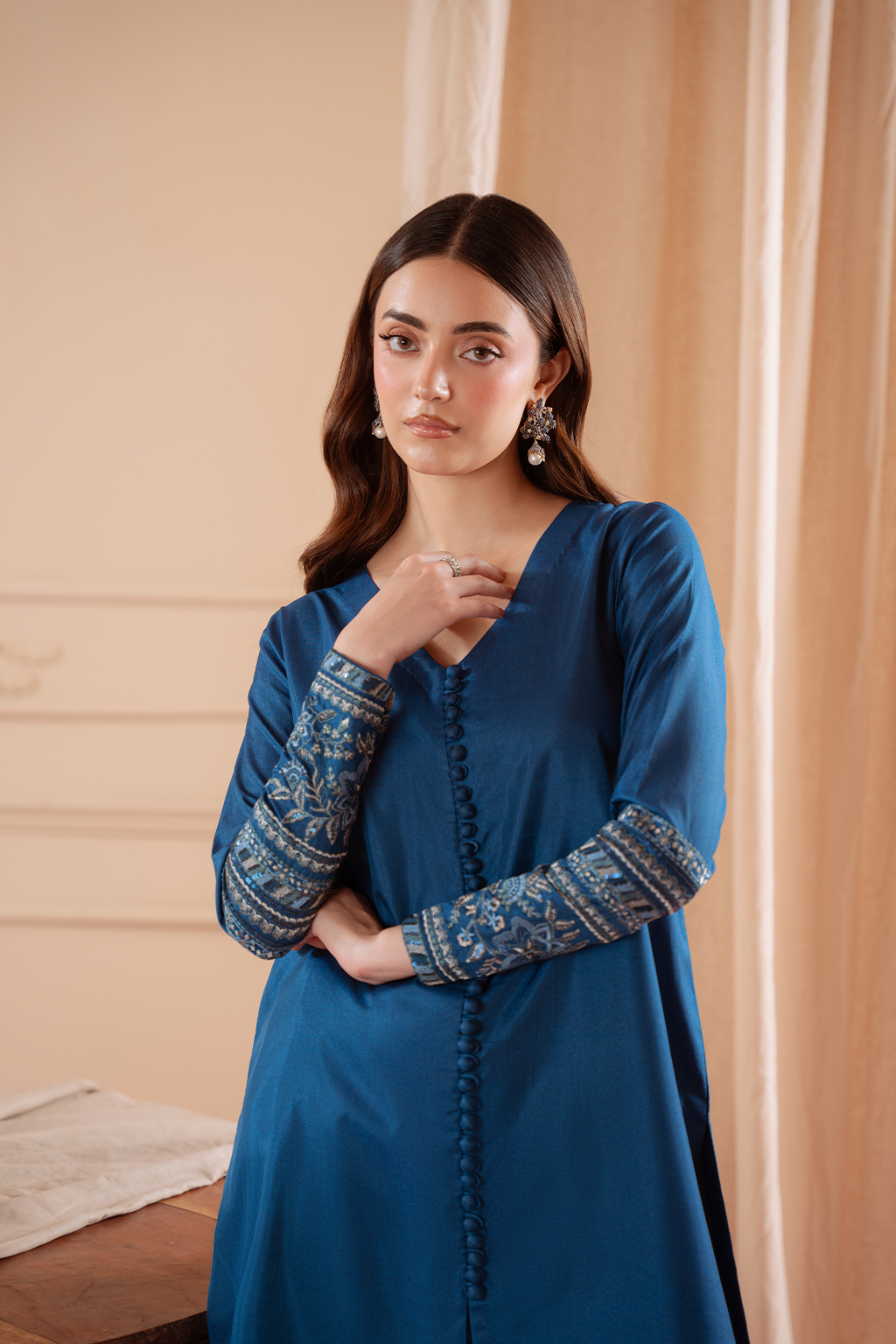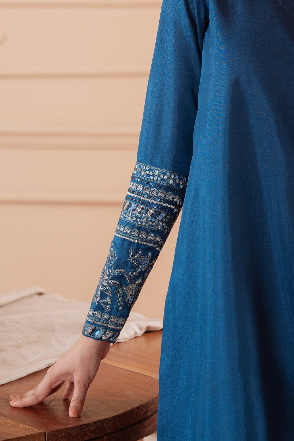 Embroidered silk shirt paired with silk Capri trouser