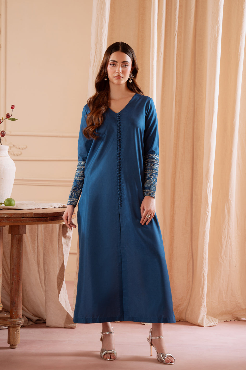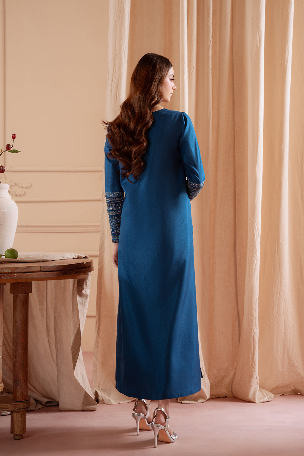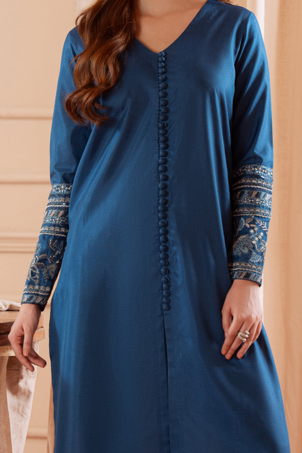 Embroidered silk shirt paired with silk Capri trouser