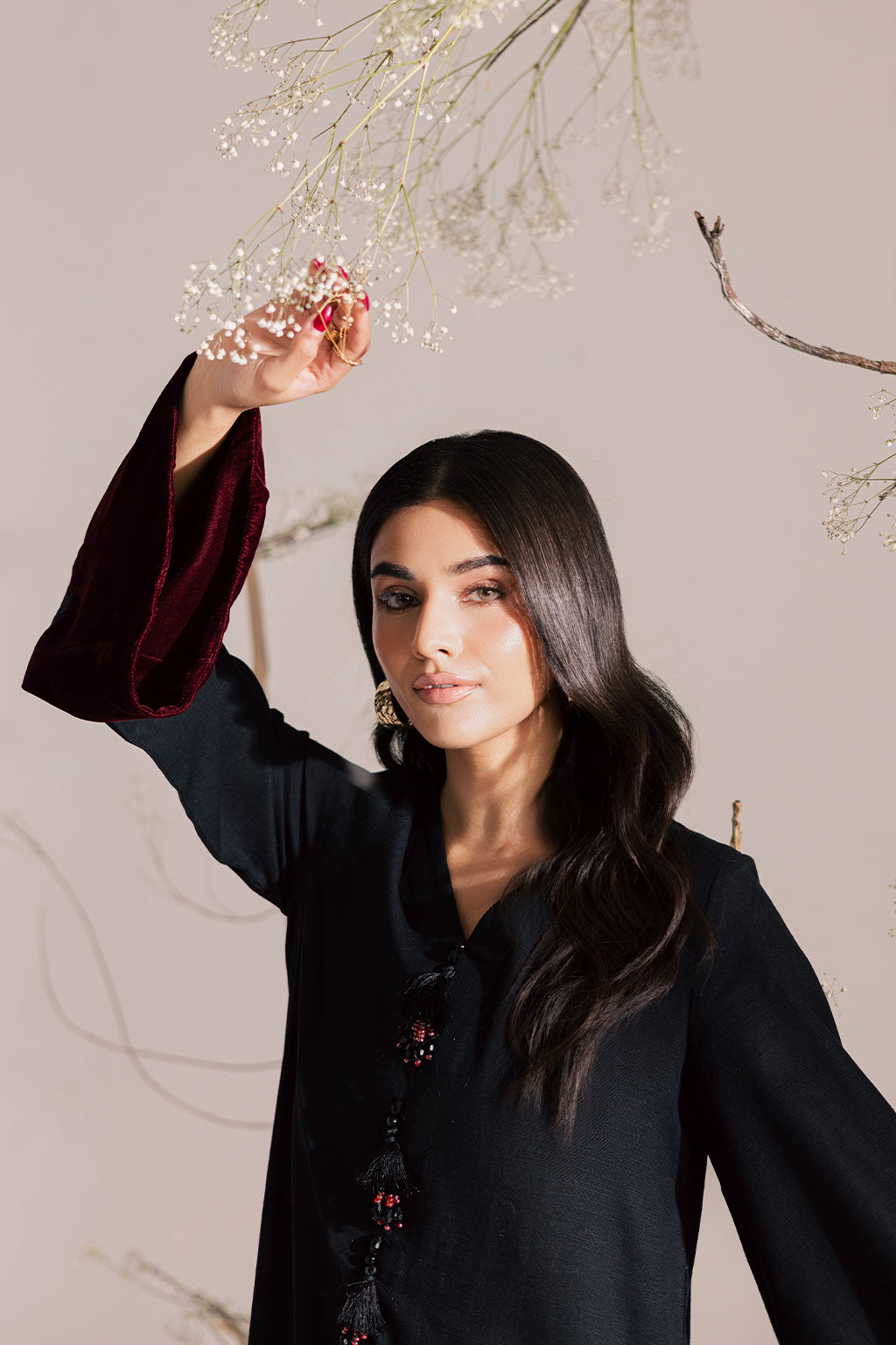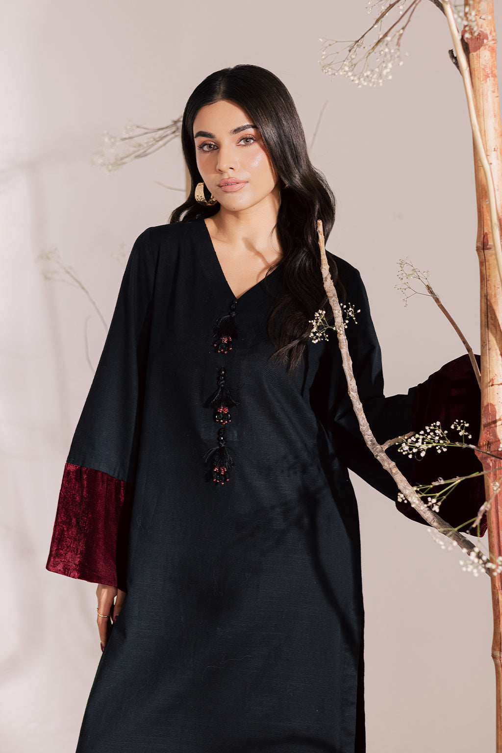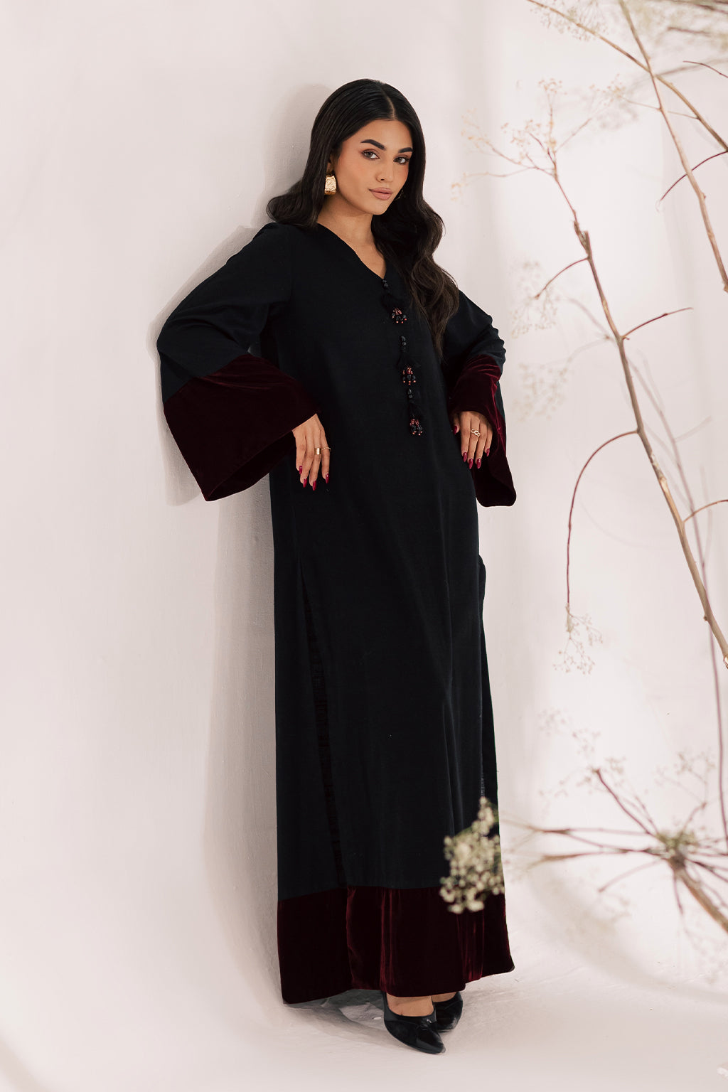 A luxurious black khaddar long shirt with contrasting velvet detail paired with khaddar straight pants.