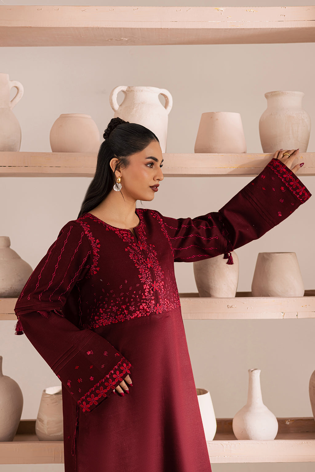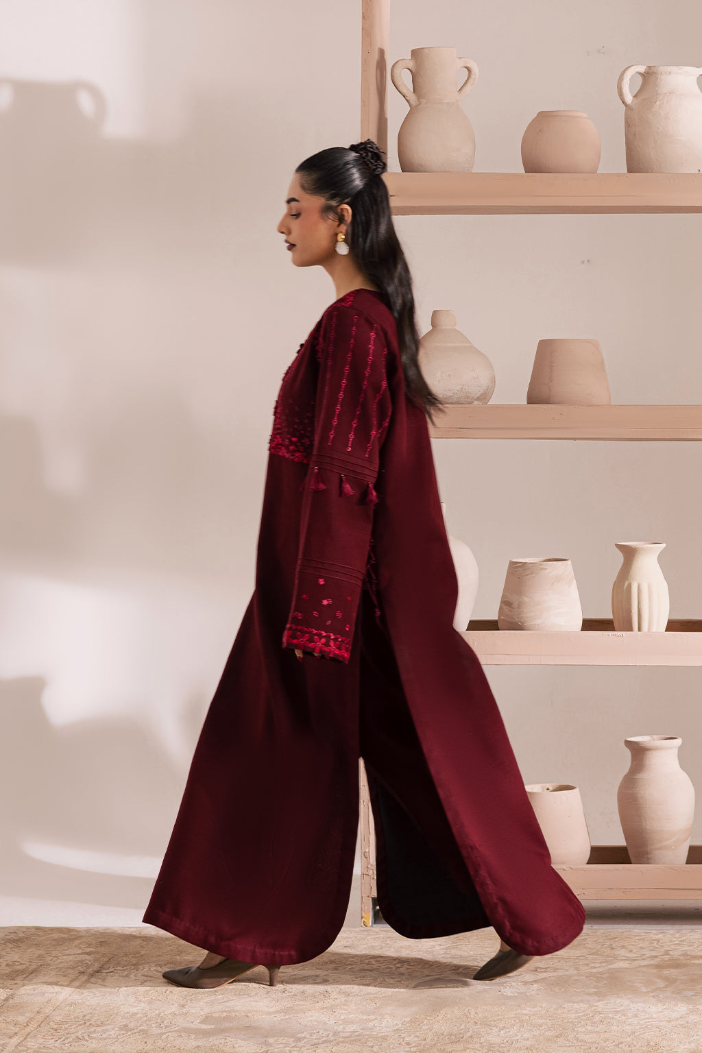 An ethereal Khaddar long shirt, beautifully embroidered with tasselling side details, paired with khaddar pants.