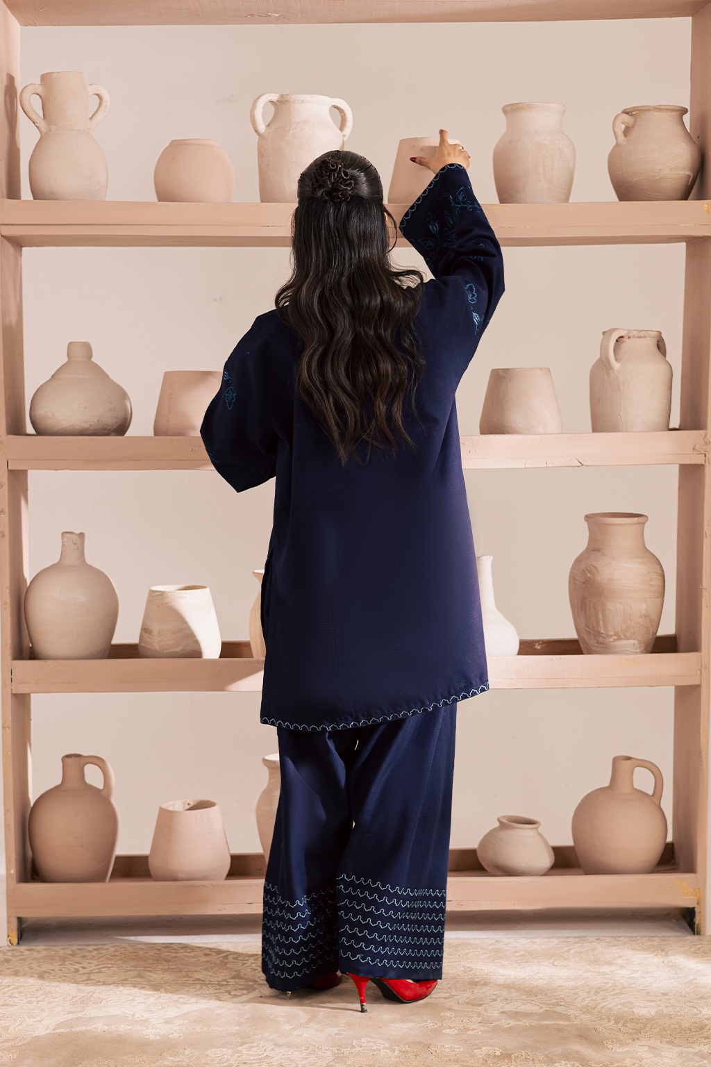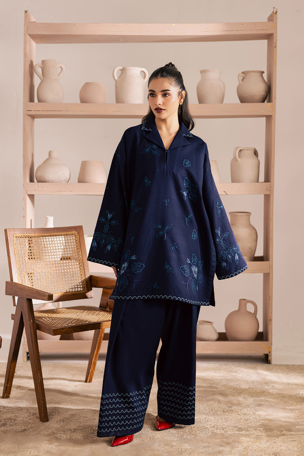 A navy blue embroidered khaddar shirt paired with embroidered farshi shalwar